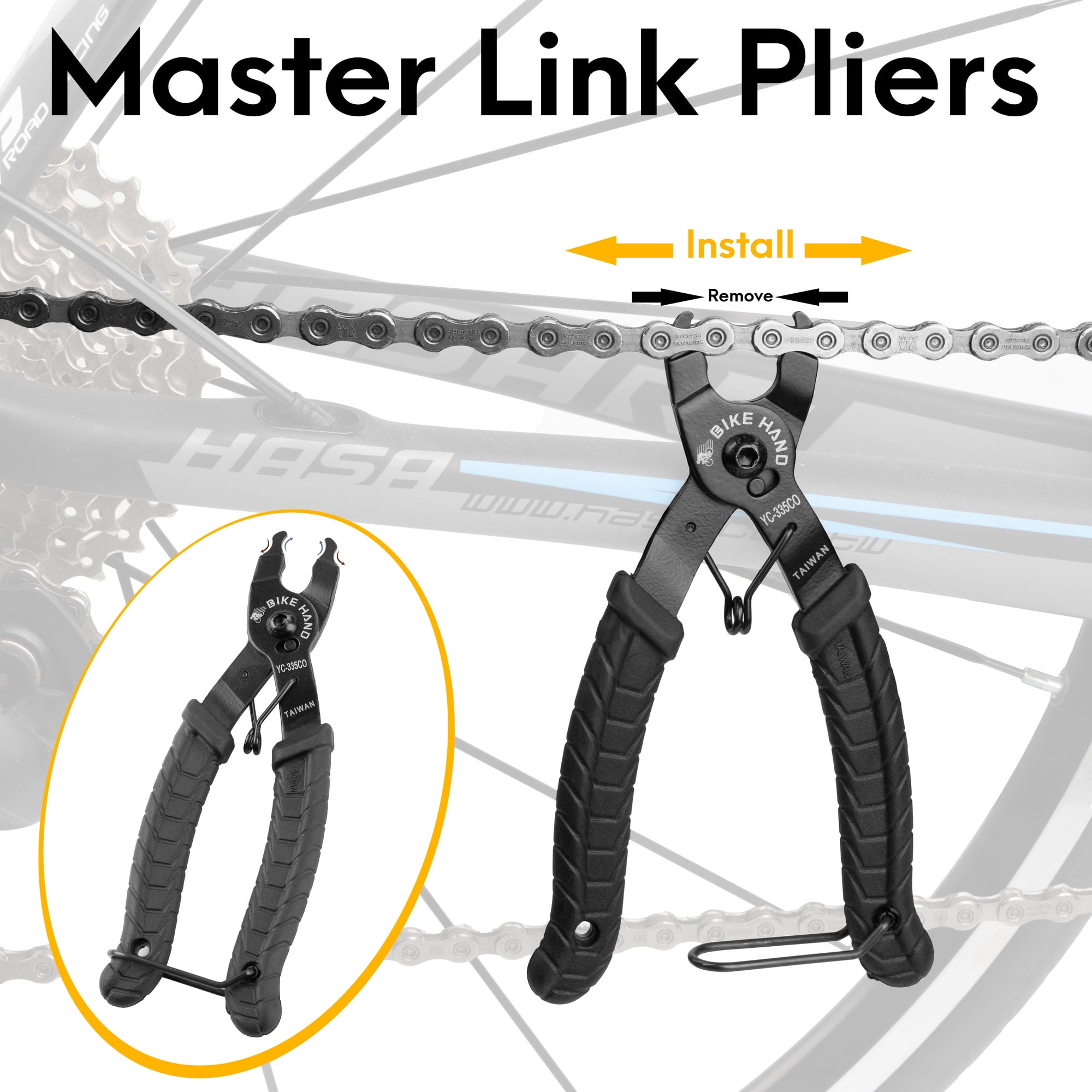 MASTER LINK PLIERS: This tool is made to easily remove and assemble the master link by inserting it into the master link and then squeezing it with the handle to close(dissemble) or open (tighten)the link. There will be no difficulty for stiff, corroded, or tough links when used. Compatible with 5 to 12 Speed chains that use a master link, including brands such as SRAM, AXS, and Shimano.