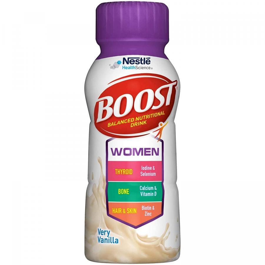 Boost Women Balanced Nutritional Drink is designed to deliver personalized nutrition for women. With 24 essential vitamins and minerals that include iodine and selenium to help support normal thyroid function; calcium and vitamin D to support strong bones; biotin and zinc to support skin and hair health; and 15 grams of protein to help maintain muscle and manage hunger.Boost Women Balanced Nutritional Drink Very Vanilla, 8 ounce Bottle, 6 Count