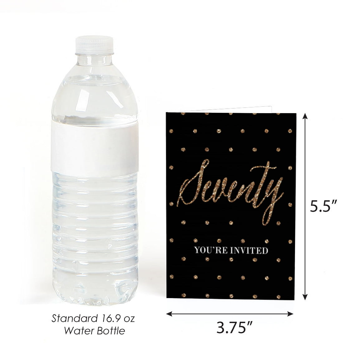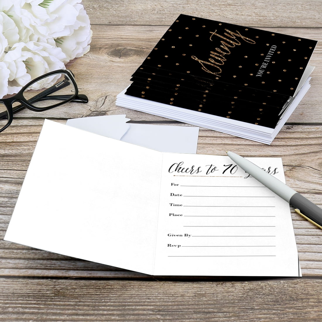 Chic 70th Birthday – Black and Gold – Fill In the Blank Invitation Set INCLUDES 8 birthday invitations and premium white envelopes.