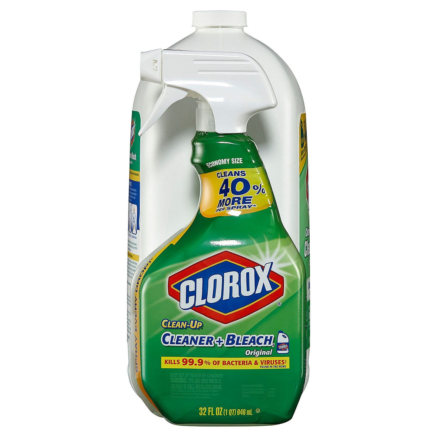 Powerful and refreshing Clorox Clean-Up Cleaner with Bleach is specially designed to quickly and effectively clean, disinfect and deodorize a variety of surfaces. It removes tough stains, grease, and dirt and kills 99.9% of germs while eliminating odors caused by bacteria, mold, and mildew. It’s great on hard, nonporous surfaces, including kitchen and bathroom, sinks, counters, refrigerators, appliances, bathtubs, toilets, fiberglass, floors, showers, and tiles. Featured in this combo pack is a 32 oz. Smart tube technology spray bottle, which lets you spray every last drop, plus a 180 oz. refill bottle that can fill more than five 32 oz. spray bottles. Clorox Clean-Up Cleaner with Bleach leaves your house smelling fresh and sparkling clean. Great for hard, non-porous surfaces, including kitchen sinks, appliances, floors, showers, and more.
