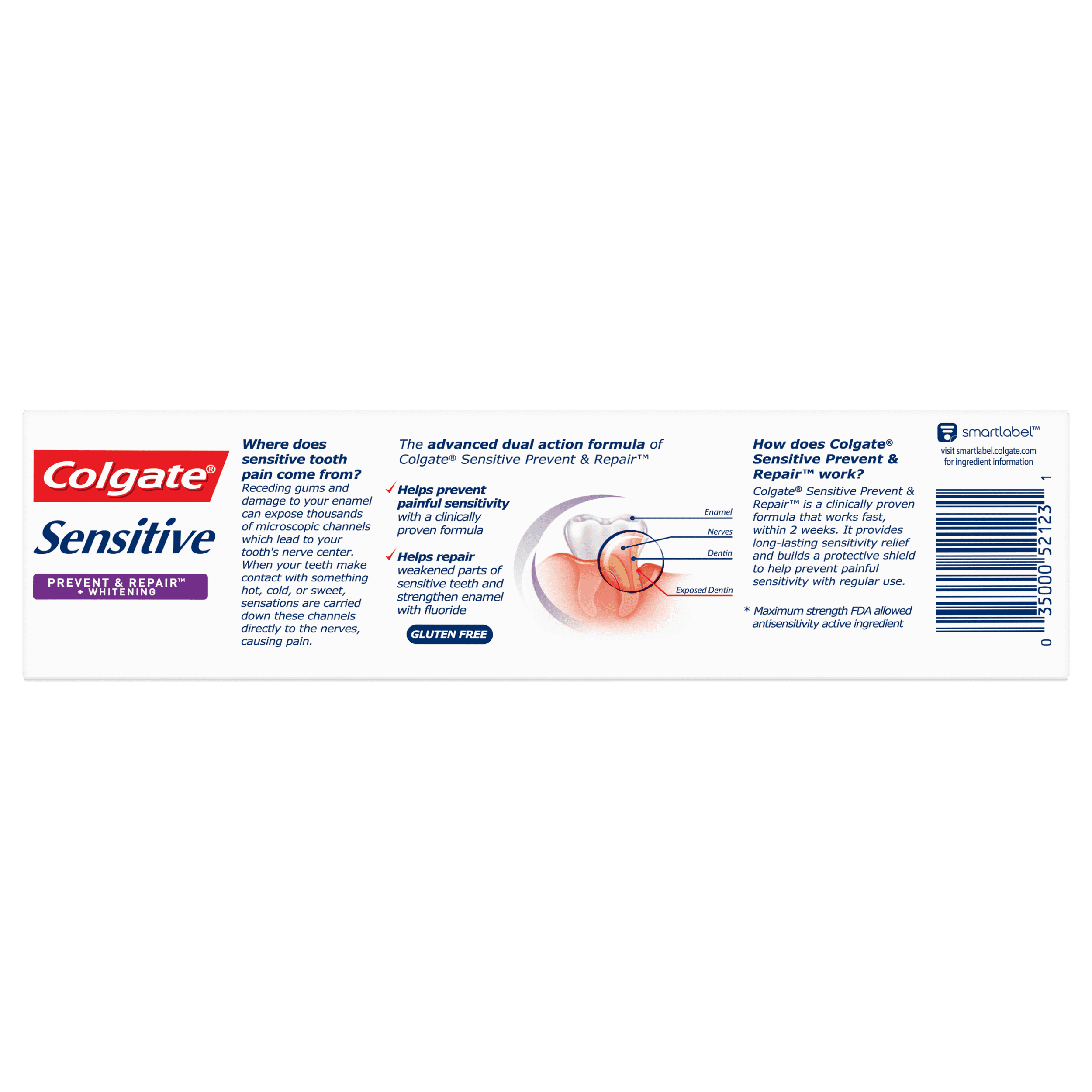 Colgate Sensitive Prevent and Repair toothpaste is a clinically proven formula that works fast, within 2 weeks, and provides long-lasting sensitivity relief and builds a protective shield to help prevent painful sensitivity with regular use. This sensitive toothpaste contains an advanced dual-action formula that helps prevent painful sensitivity and helps repair weakened parts of sensitive teeth. Plus Colgate Sensitive Prevent and Repair toothpaste helps strengthen enamel with fluoride, whiten teeth, defend against cavities and provides the freshness you trust from Colgate.