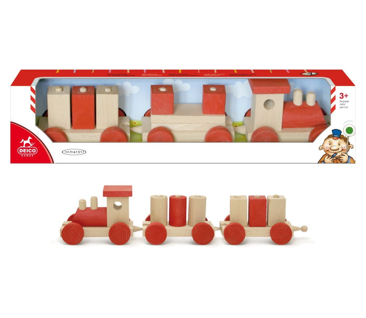 No batteries are needed for imagination. Encourage creativity and play with a wooden train set designed for good old-fashioned fun. Removable blocks slide on an off adjoining carriages to aid in the development of fine motor skills and eye-hand coordination. For ages 3+