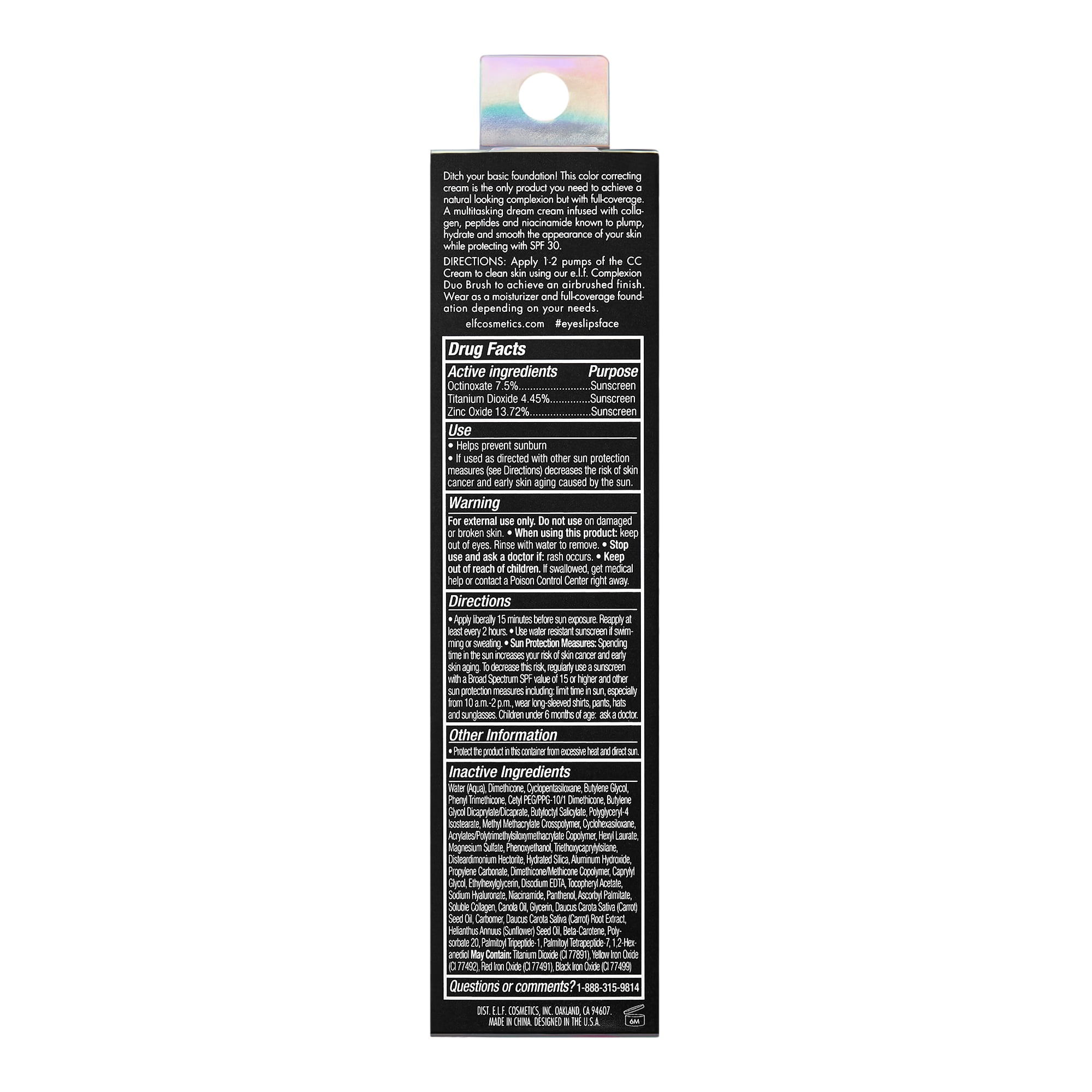 Ditch your basic foundation! The e.l.f. Cosmetics Camo CC Cream is a color correcting cream that is the only product you need to achieve a natural looking complexion but with full coverage. A multitasking dream cream infused with collagen, peptides and niacinamide known to plump, hydrate and smooth the appearance of your skin while protecting with SPF 30. Apply using our e.l.f. Complexion Duo Brush to achieve a flawless, airbrushed finish.