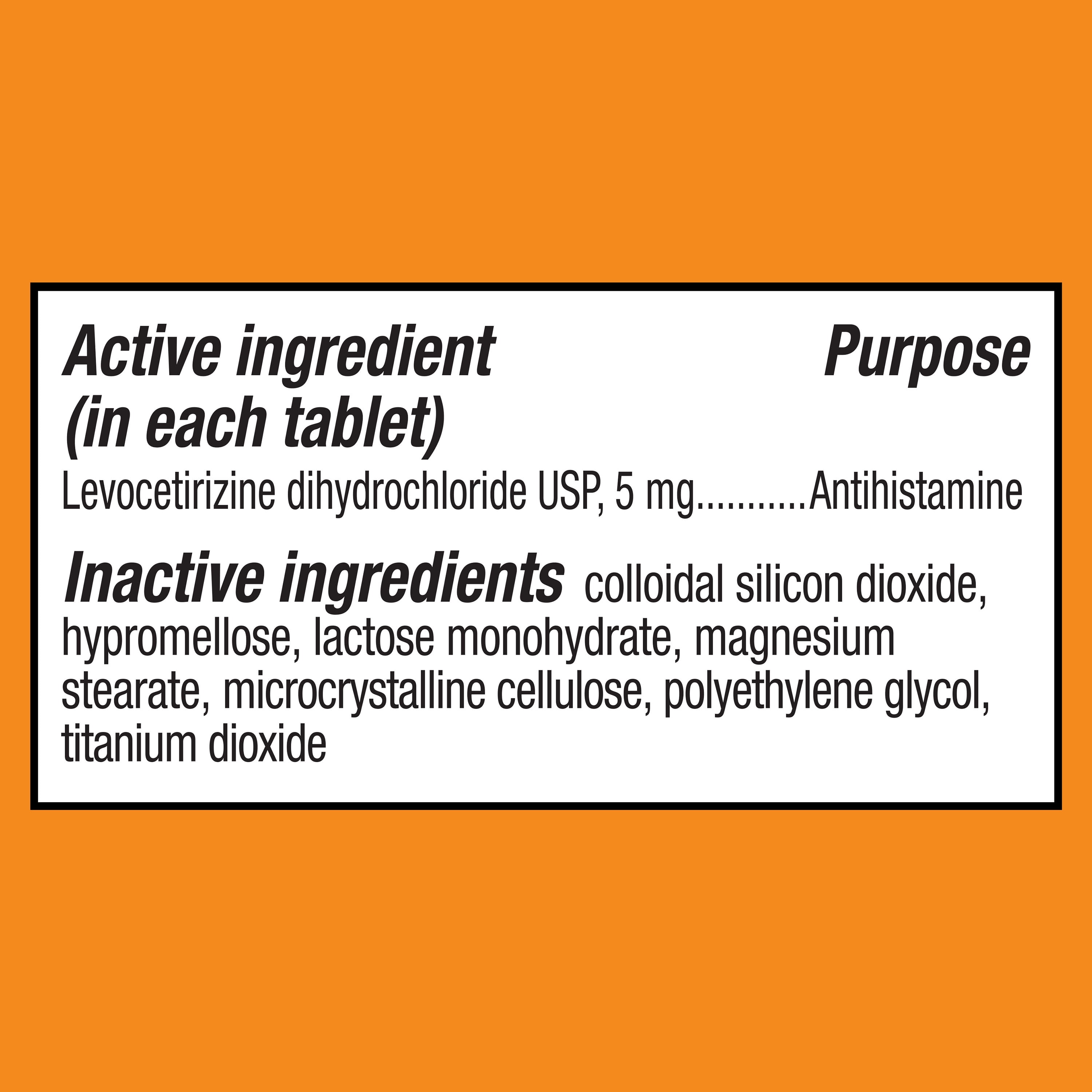 - Active ingredient (in each tablet): Levocetirizine Dihydrochloride USP 5 mg (antihistamine)