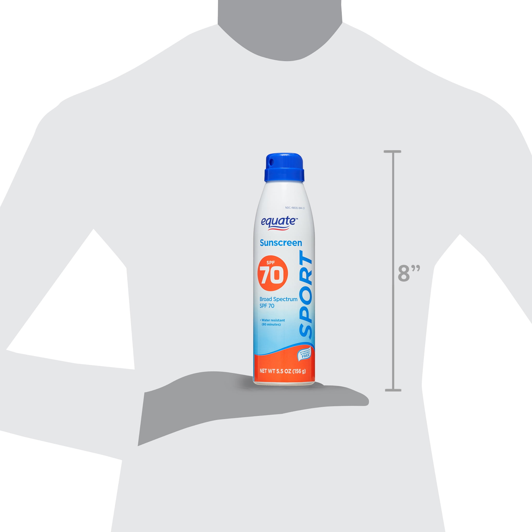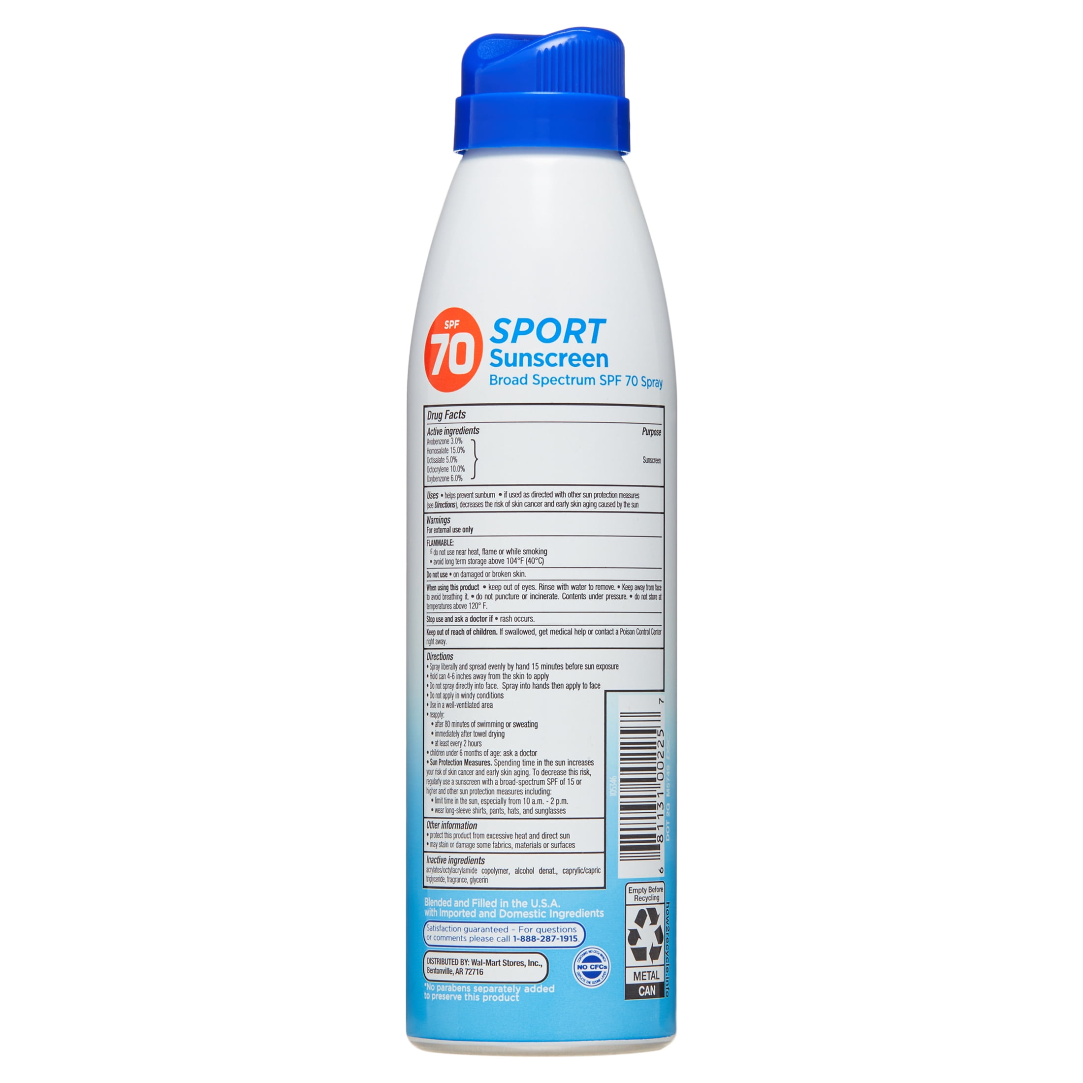 Broad Spectrum SPF 70 Spray Paraben free. No parabens separately added to preserve this product Uses helps prevent sunburn if used as directed with other sun protection measures (see Directions), decreases the risk of skin cancer and early skin aging caused by the sun Drug Facts Active ingredients – Purpose Avobenzone 3.0%, Homovalvate 15.0%, Octisalate 5.0%, Octocrylene 10.0%, Oxybenzone 6.0% – Sunscreen Equate Sport Broad Spectrum Sunscreen, SPF 70 is uniquely formulated to provide superior protection against the sun’s damaging rays. Studies show that applying sunscreen can significantly decrease the risk of skin cancer and early skin aging caused by natural sun exposure. Protect your skin with our powerful, quick-absorbing, long-lasting SPF 70 spray sunscreen that is designed to spray on soft and evenly and stay on strong. Whether you’re hiking up mountains, running outside, or just getting some well-deserved rest and relaxation at a scenic beach, our sweat and water-resistant, grease-free formula keeps you protected for up to 80 minutes. Traditional lotion sunscreen can be difficult and time consuming to apply. That’s why spray sunscreen is perfect for fast and effective application for all those tough-to-reach places. Have fun in the sun with protection you can trust with Equate Sport Broad Spectrum Sunscreen, SPF 70.