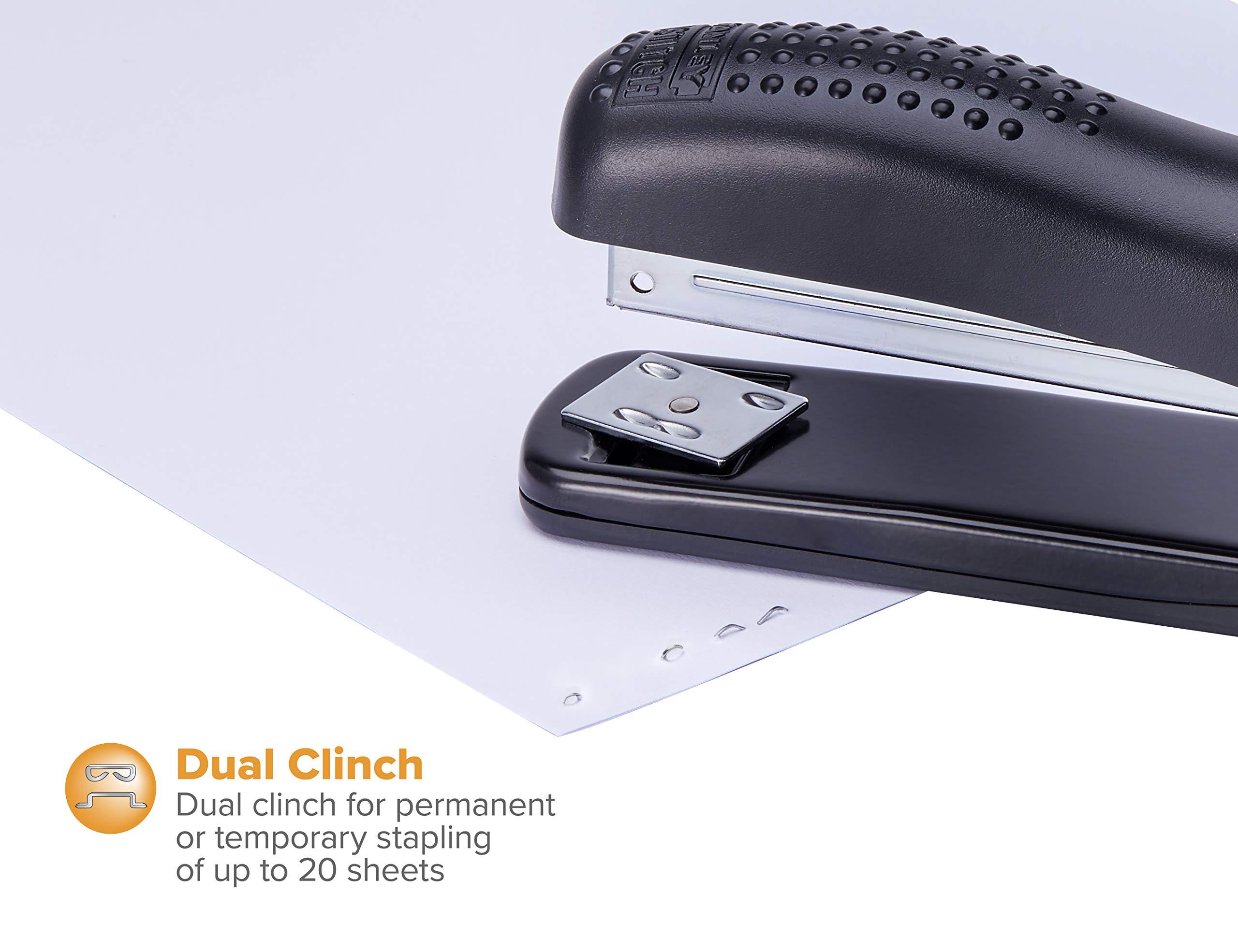 Comfortable and reliable performance. Strong all-metal internal construction with a curved ergonomic silhouette for comfort. Stapler opens up for bulletin board tacking. Adjustable Dual Clinch for the option of traditional standard stapling or temporary stapling. Visual staple reload alert window reveals staple supply to avoid surprise staple shortages. 20 sheet capacity. Uses Premium Standard Staples. Perfect for school, work, or the home office. Lifetime Limited Warranty.