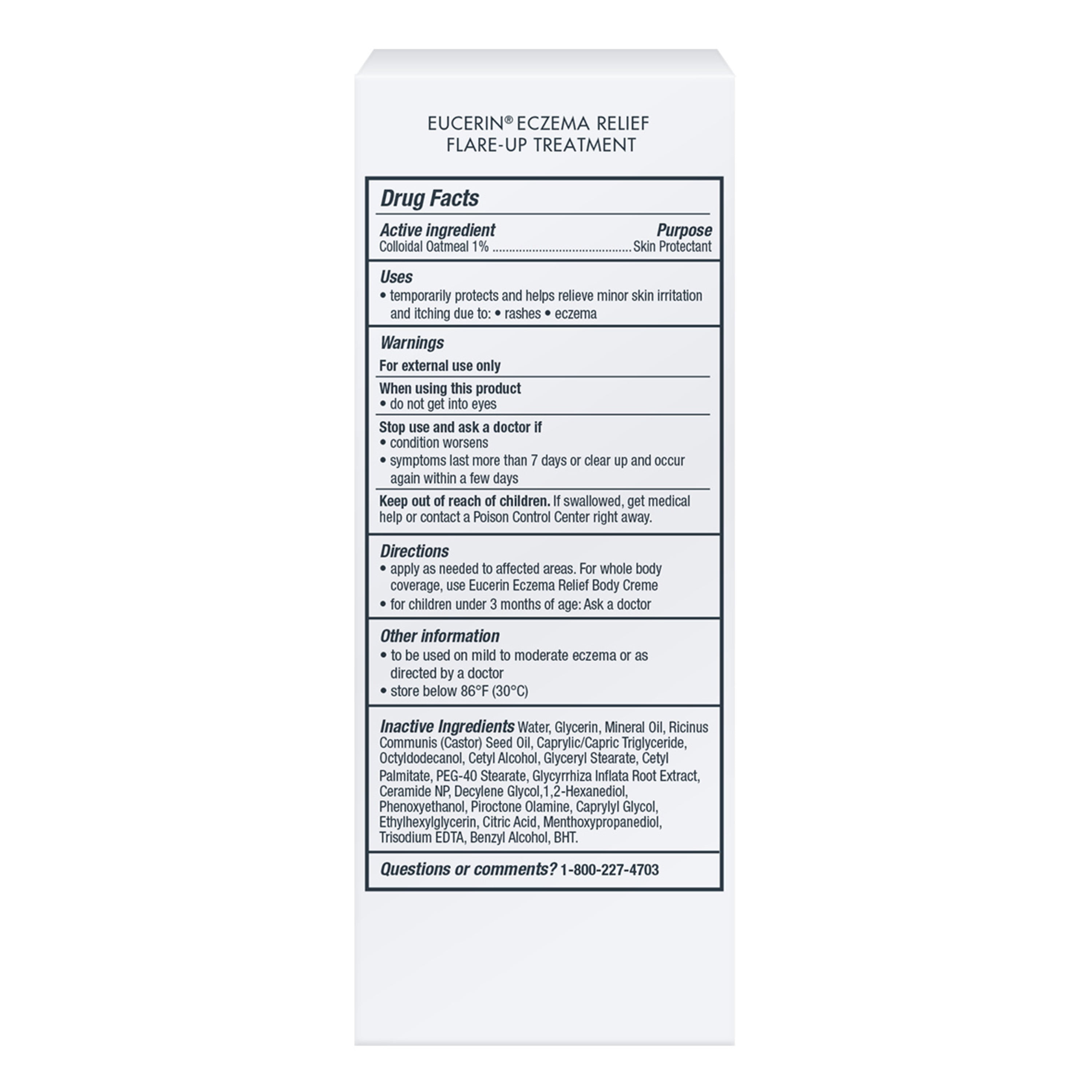 - Eucerin Eczema Cream Flare-Up Treatment is formulated with Colloidal Oatmeal (a skin protectant), Ceramide-3 and Licorice Root Extract