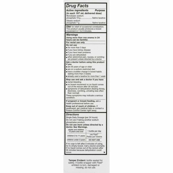 Fleet Enemas are latex free. Ready-to-use. Latex free. Soft, flexible Comfortip. Easy squeeze. Extra cleansing. Extra relief. No. 1 doctor recommended. 70% extra volume. 70% more volume than regular Fleet enema. Provides extra cleansing and extra relief. Clinically proven to be both safe and effective. Protective shield prevents contamination. Pre-lubricated Comfortip for ease of insertion. One-way safety valve controls flow and prevents reflux. Easy squeeze bottle. Each 197-ml delivered dose contains: sodium 4.4 g. This product generally produces a bowel movement in 1-5 minutes.