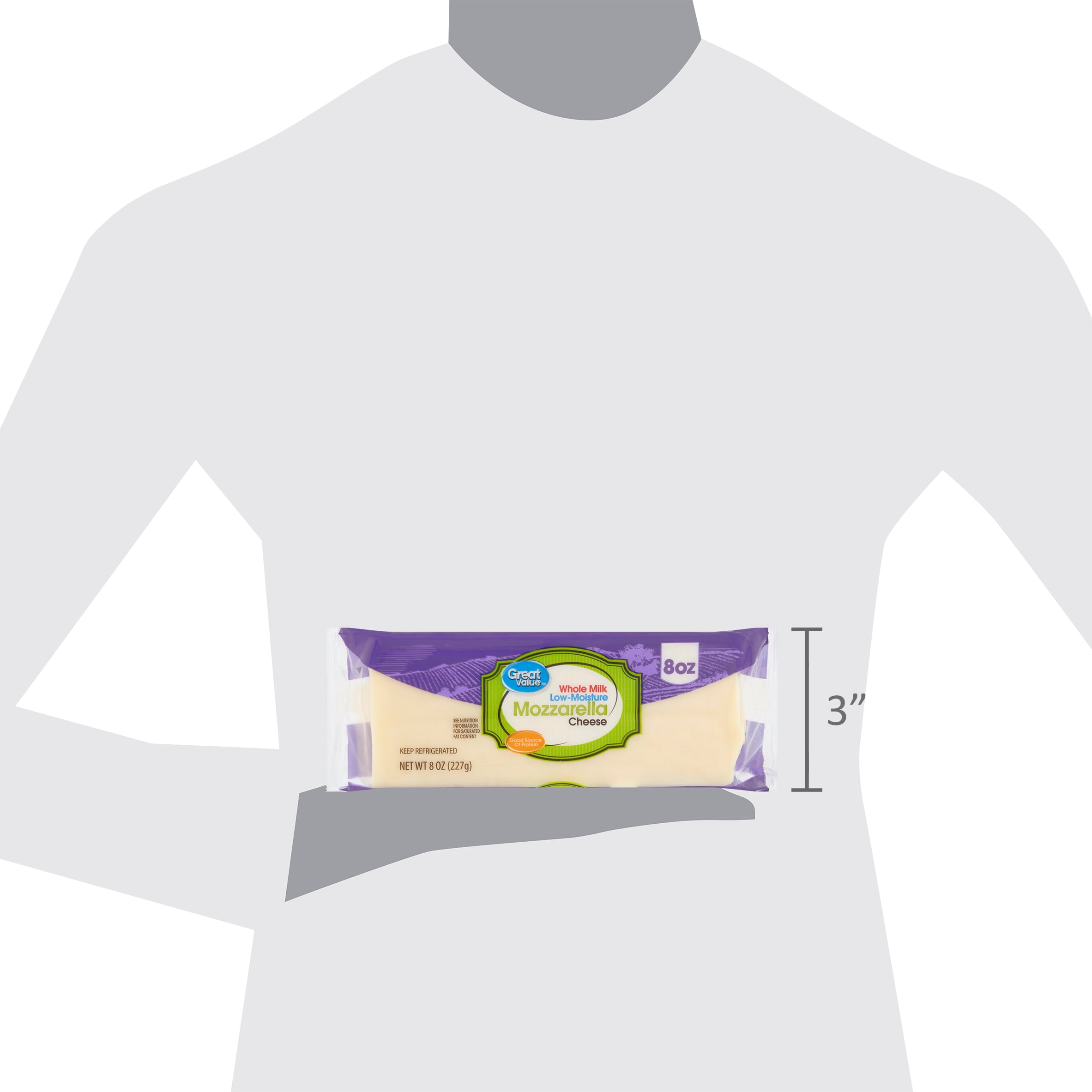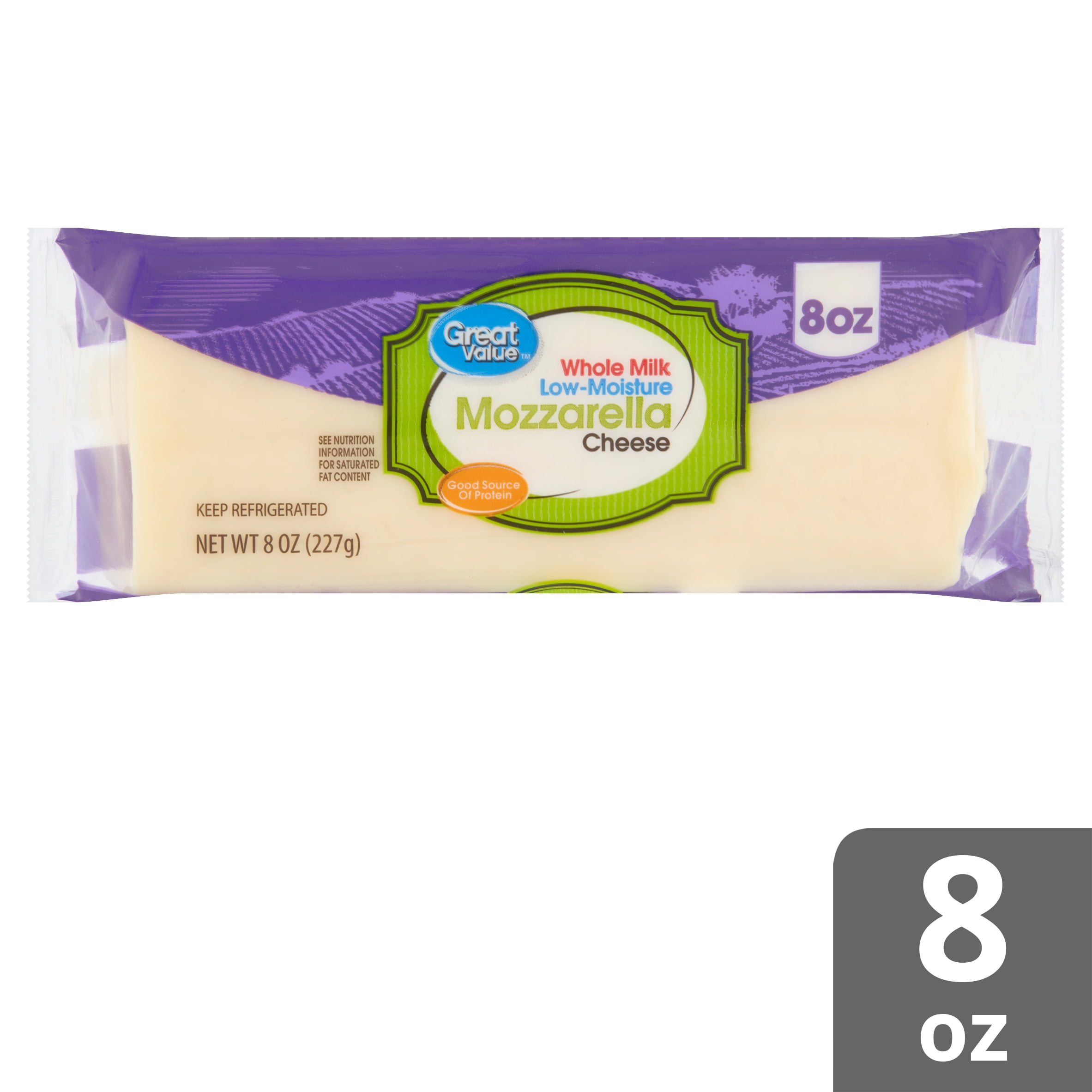 Bring an Italian classic to your table with Great Value Whole Milk Low-Moisture Mozzarella Cheese. This supple, flavorful cheese has just the right amount of saltiness, and melts and browns beautifully, so it is the ideal topping for pizza, lasagna, and other Italian-influenced foods. Made with rich, whole milk, this Mozzarella is a tasty snack on its own and adds delicious flavor and pleasing texture to all your favorite cheesy meals. The 8-ounce package is an ideal size for cheese-focused recipes and provides a generous amount for snacks and cheese plates. Give your meals the cheese they deserve with Great Value Whole Milk Low-Moisture Mozzarella Cheese.