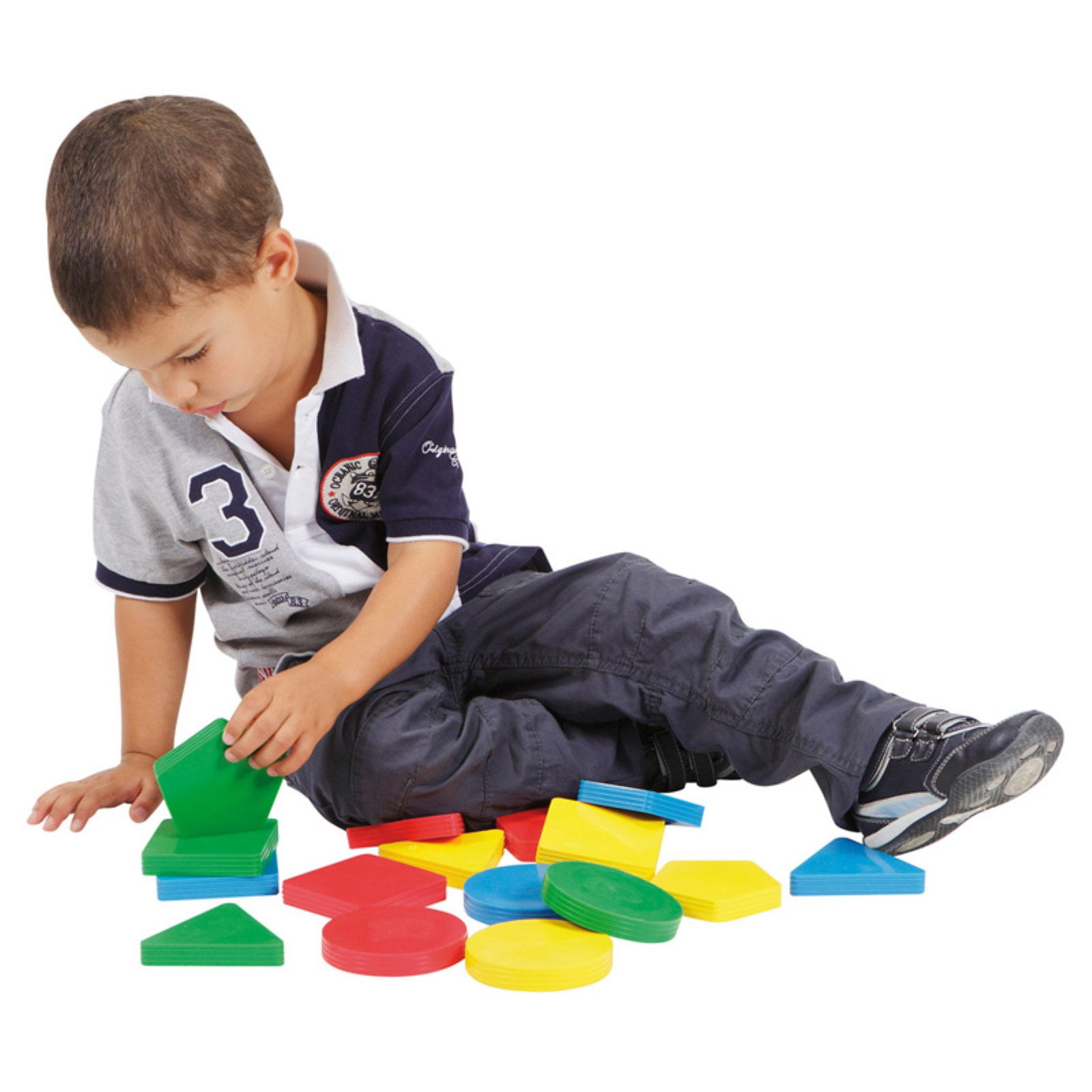 - 16-piece set of soft geometrical forms: four of each shape (circle, square, triangle, and pentagon), and each shape set has 1 of each color (red, blue, green, and yellow)