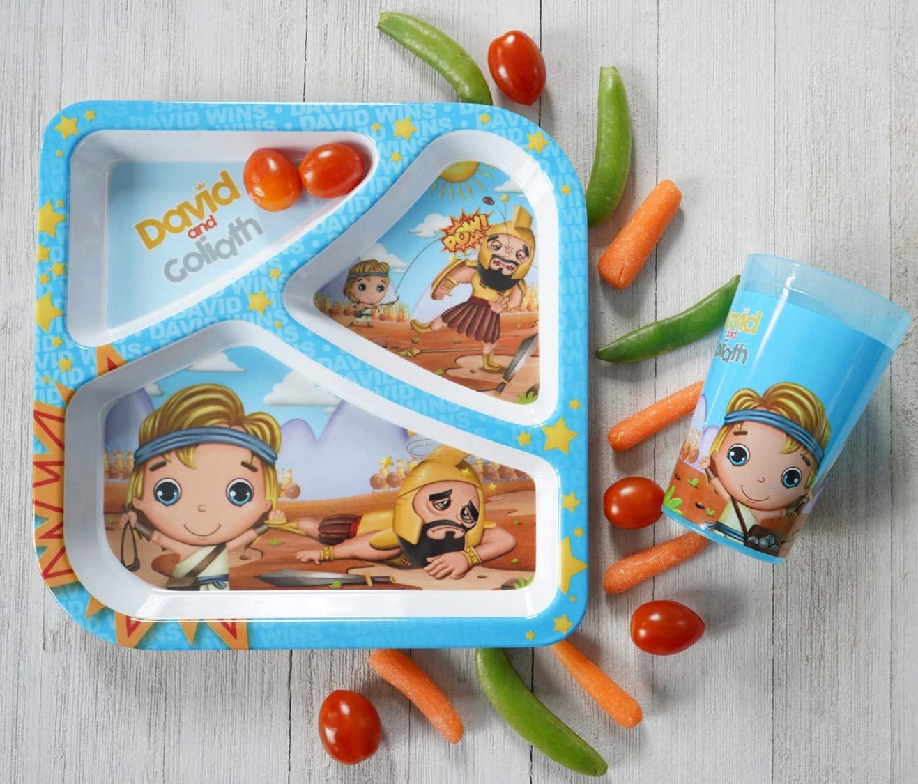 Tell the little ones a true story during their meal. Talk about how young David faces the giant Goliath and is triumphant. The army of Israel celebrates the great victory.He Loves Me Kids Feeding Gift David and Goliath 5 Piece Set Toddler Dishes Multicolor, BPA Free, Kids Dinnerware Sets Includes Baby Place Mats, Divided Plate, Round Bowl, Round Plate and Children’s CupPlate, baby, bowls, children, dinnerware, biblestories, feeding, divided plates, placemat, cup, kids, girls, boys, breakfast,lunch, dinner, snack, party, gift, David and Goliath