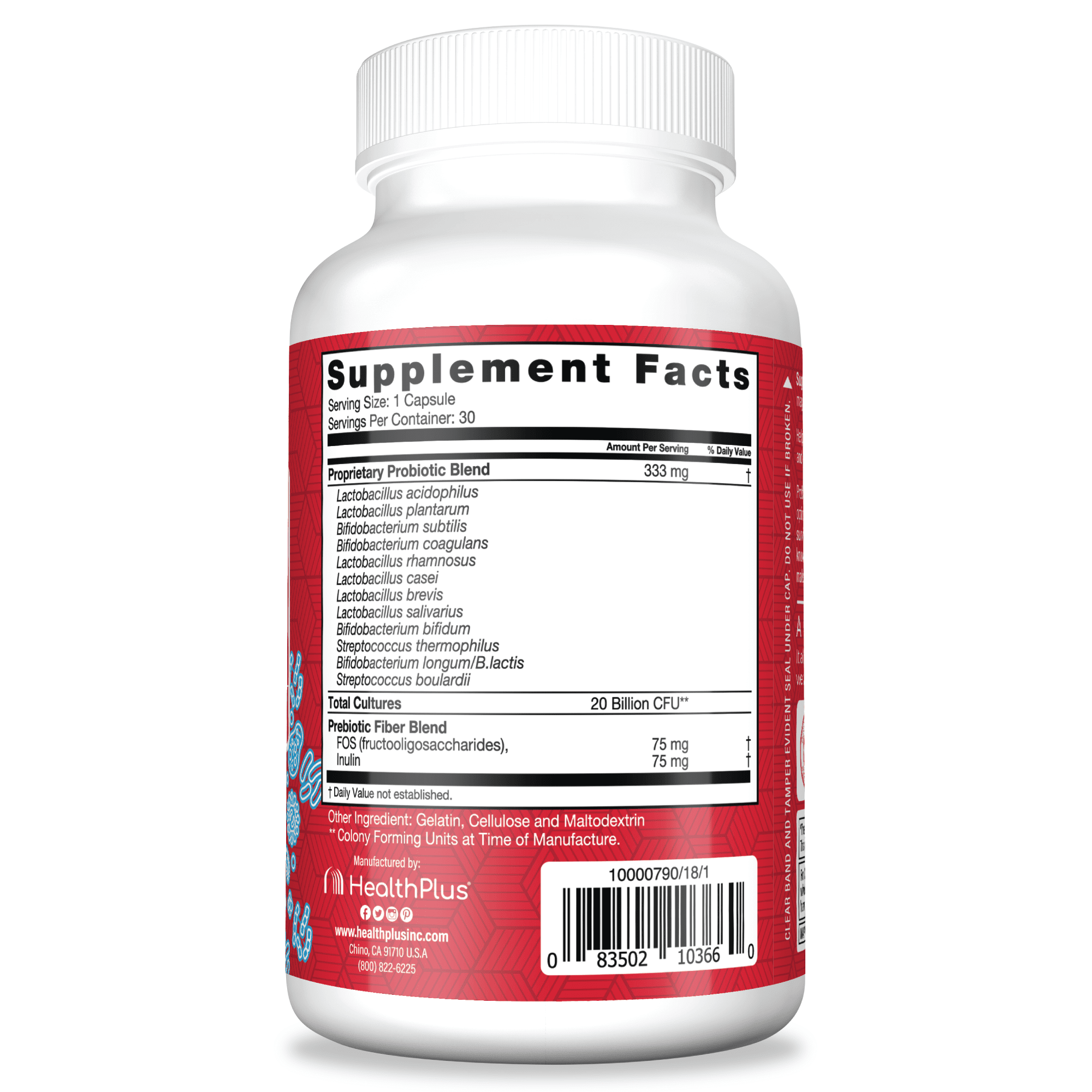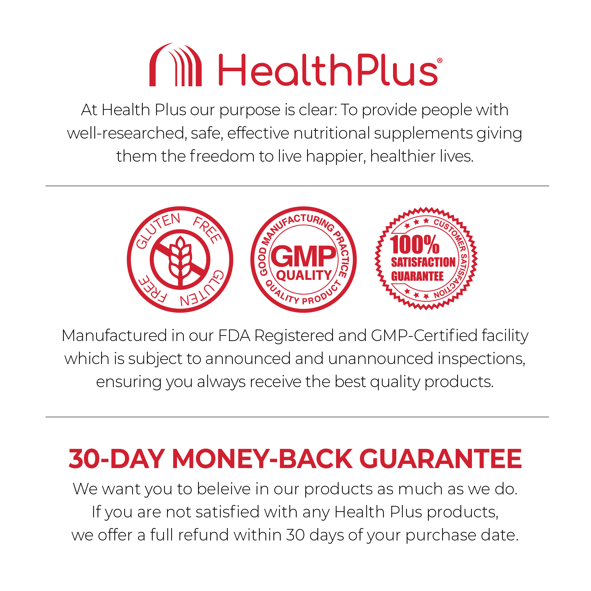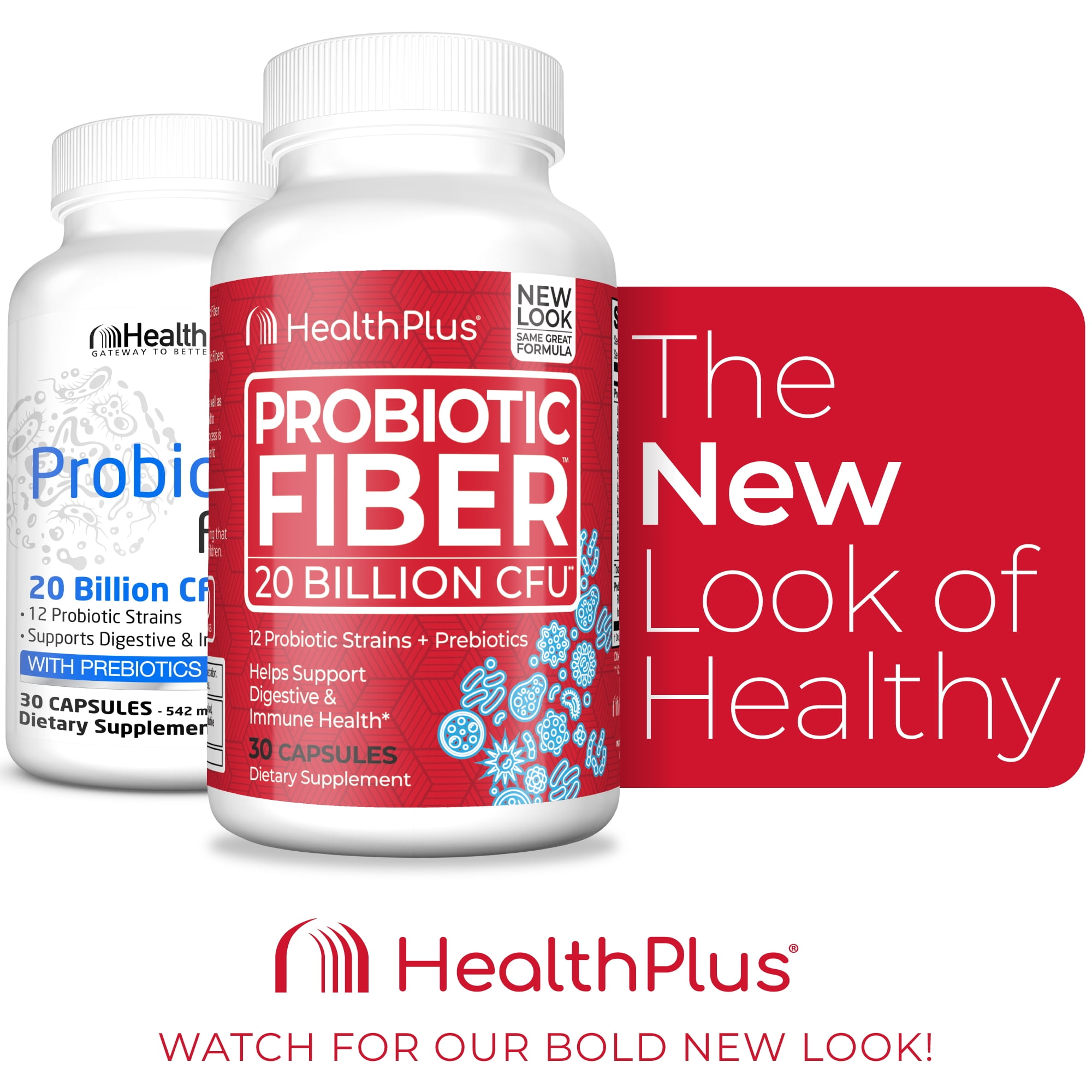 Health Plus Probiotic Fiber helps nourish your colon with what it craves to stay healthy: Prebiotics Fibers and a balanced spectrum of 12 Probiotic strains. Probiotics are major contributors to a healthy immune response as well as optimal digestive health. Being live organisms, Prebiotics are fibers that our Probiotics can digest. Made with Shelf Stable Coagulans, each order of Health Plus Probiotic Fiber includes 30 capsules, 542 mg each. For more than 30 years, Health Plus has been committed to developing and manufacturing the highest quality supplements available. To this day, they remain committed to their roots by offering a full range of innovative products that support healthier lifestyles and overall wellness. After all, a healthy outside starts from the inside, so all Health Plus products are formulated using raw, high-quality ingredients in their many varieties of healthful cleanses, fibers, flavors, recipes and more. Inspired by purpose and driven by passion, Health Plus is raising the bar to a gateway for better health.