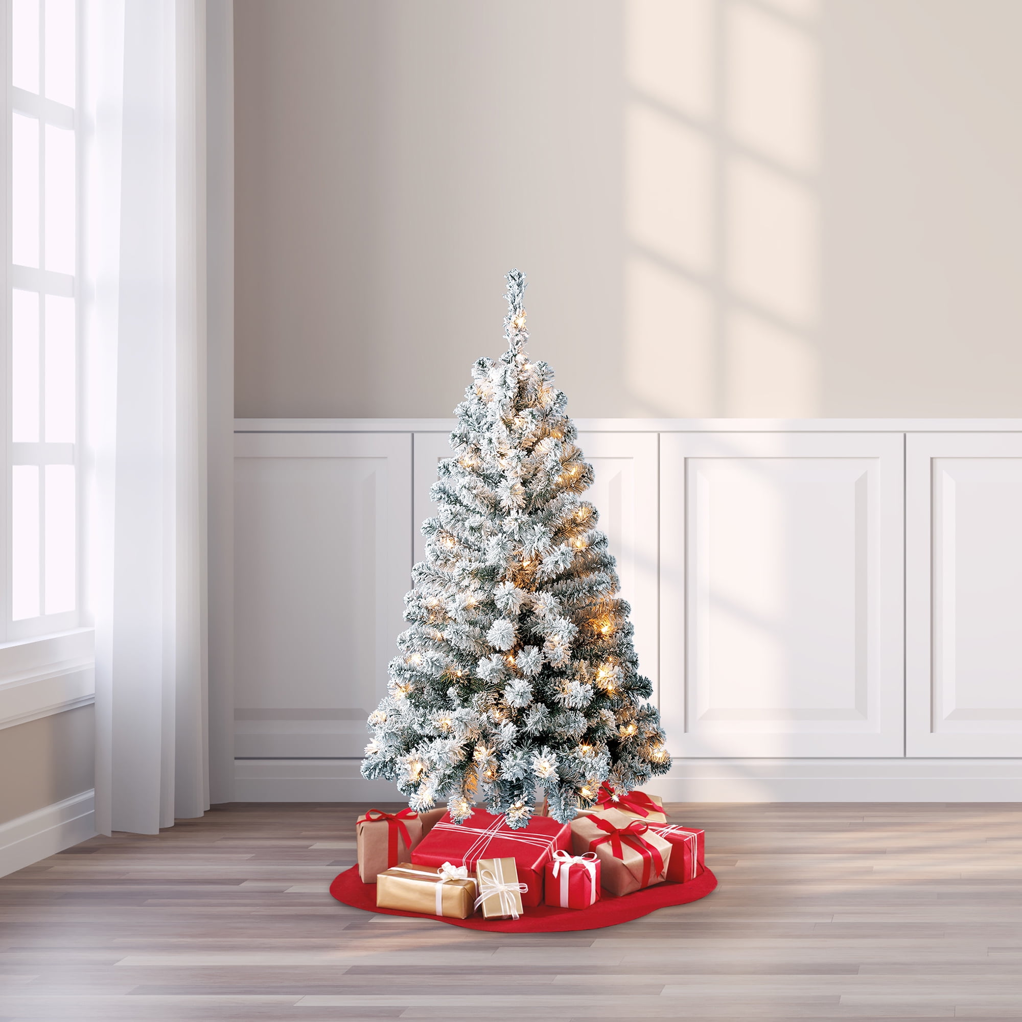Holiday Time Pre-Lit Greenfield Flocked Pine Artificial Christmas Tree, Clear Incandescent Lights, 4′: