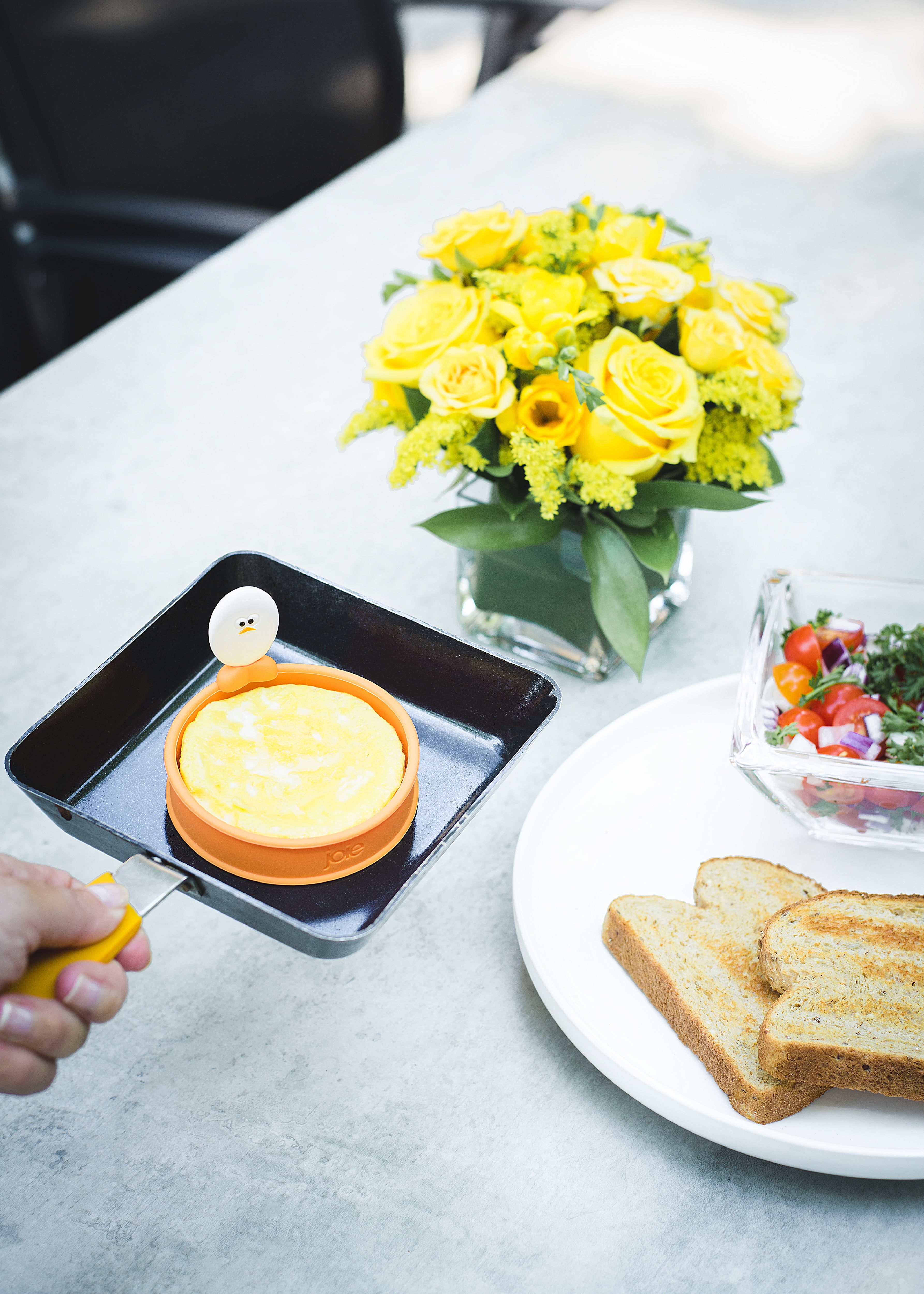 - Silicone egg ring makes round-shaped eggs every time