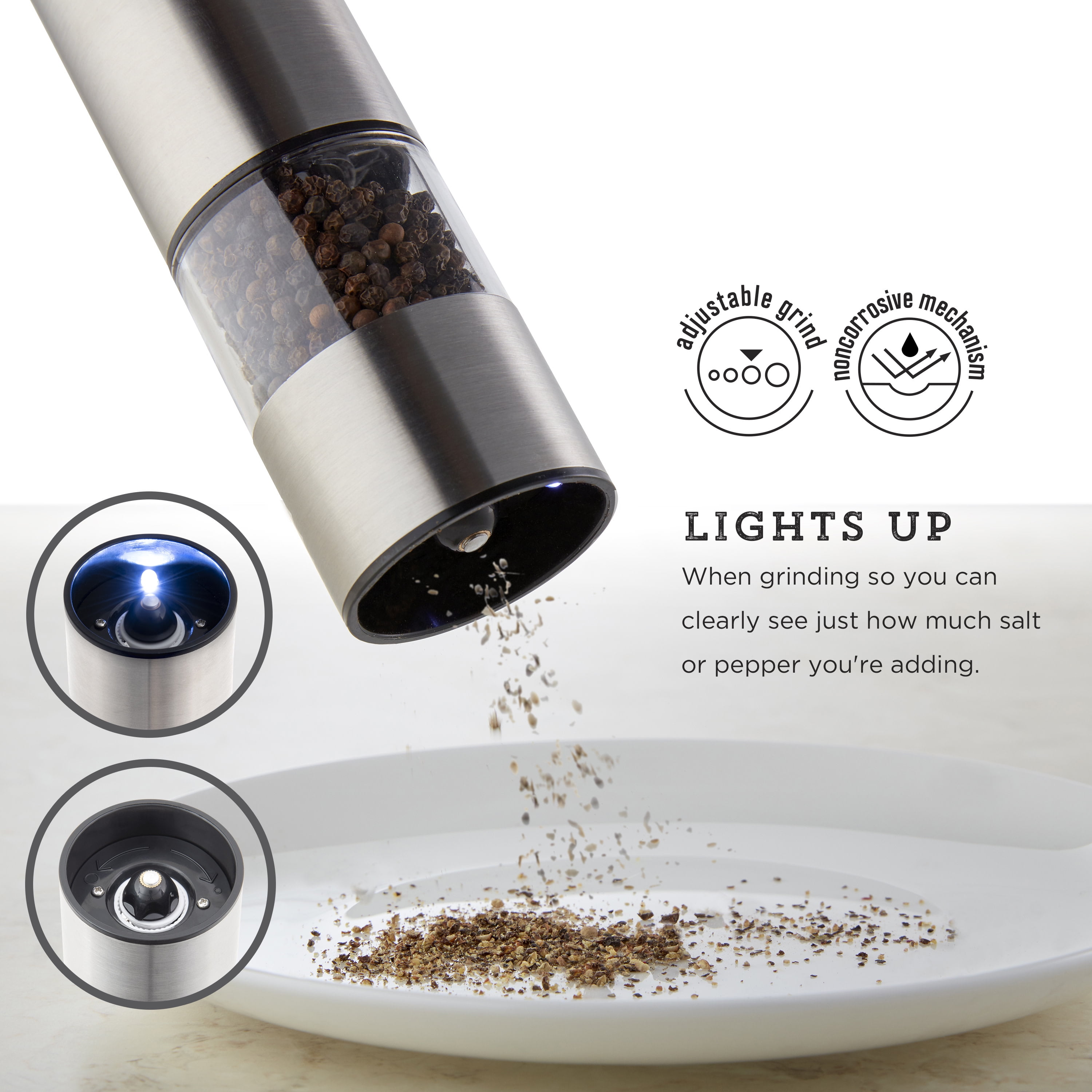 - SMART DESIGN: features an LED light that turns on when grinding to avoid over seasoning