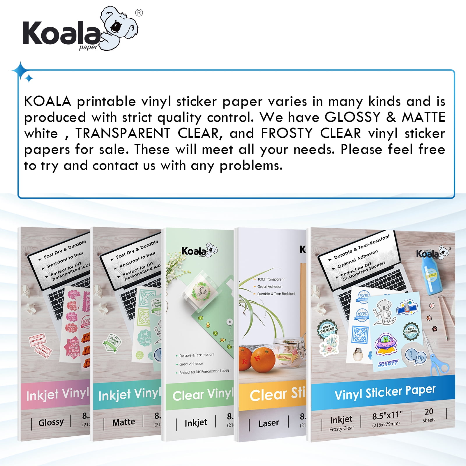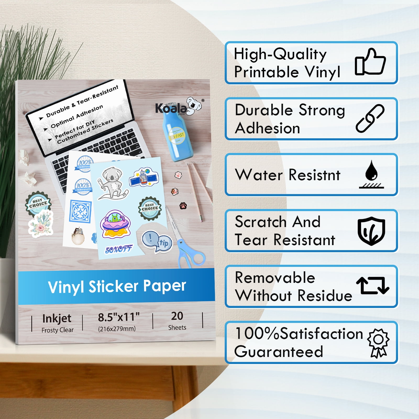 KoalaPaper Printable Vinyl Sticker for inkjet printers, works with most laserjet printers as well, It has a smooth glossy translucent clear surface and removes cleanly, leaving no sticky residue. This self-adhesive vinyl sticker paper are enviromental friendly paper. Our waterproof vinyl sticker paper is made from durable material for superior ink retention and anti tear and scratch resistant. It can repel water and prevent smearing.