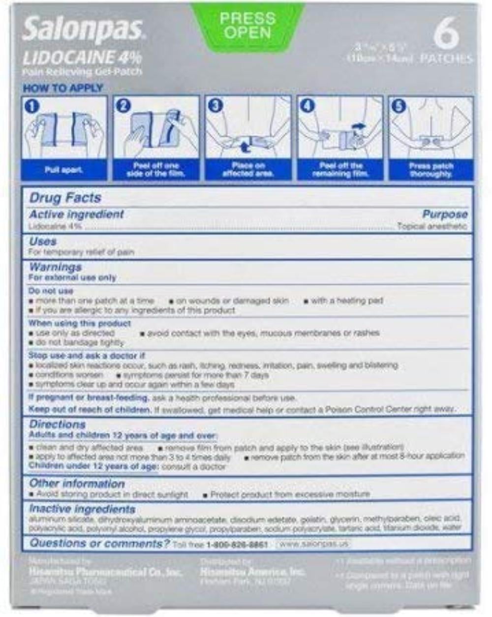 - Lidocaine Pain Relieving Gel- Patch provides temporary relief of pain associated with back, neck, shoulders, knees and elbows.