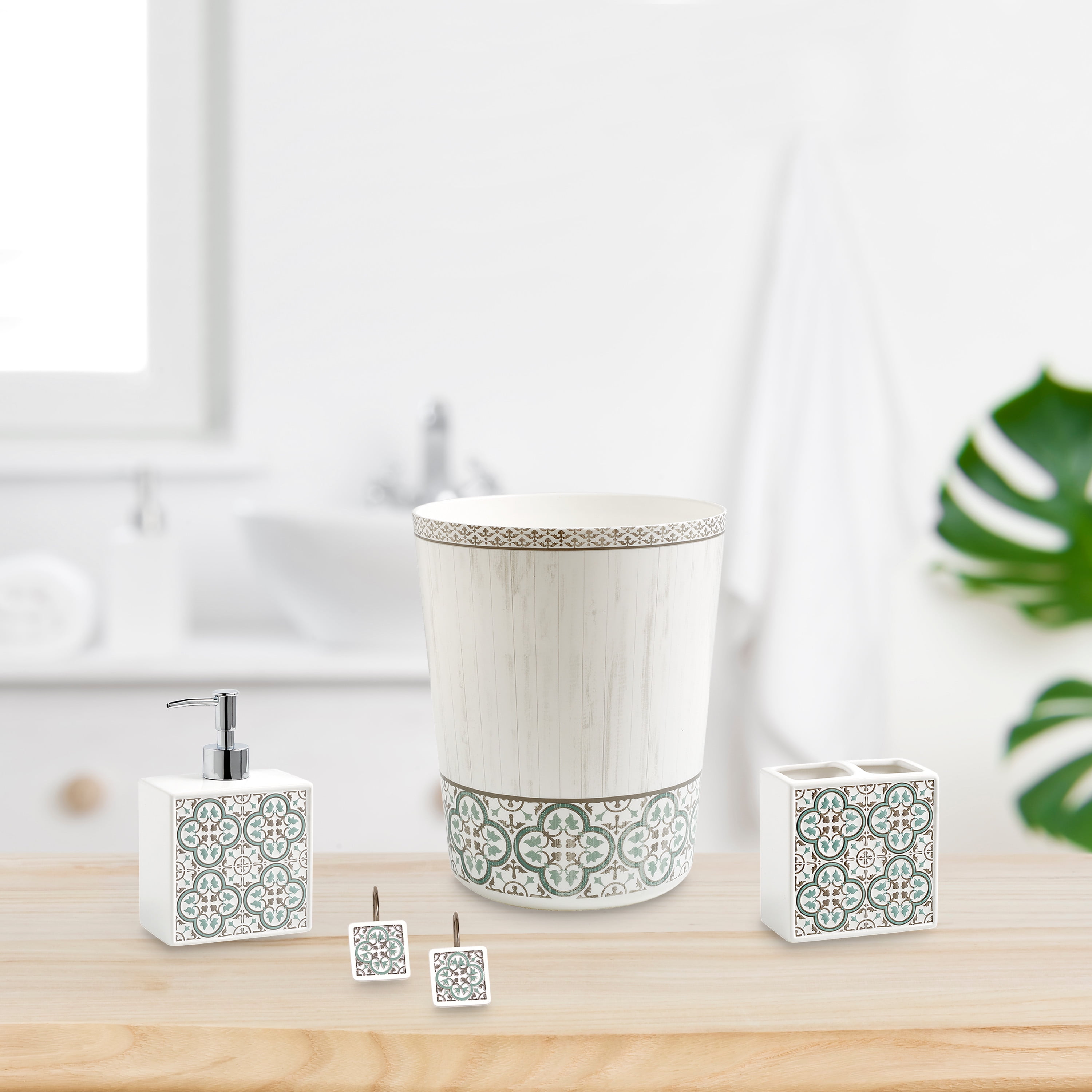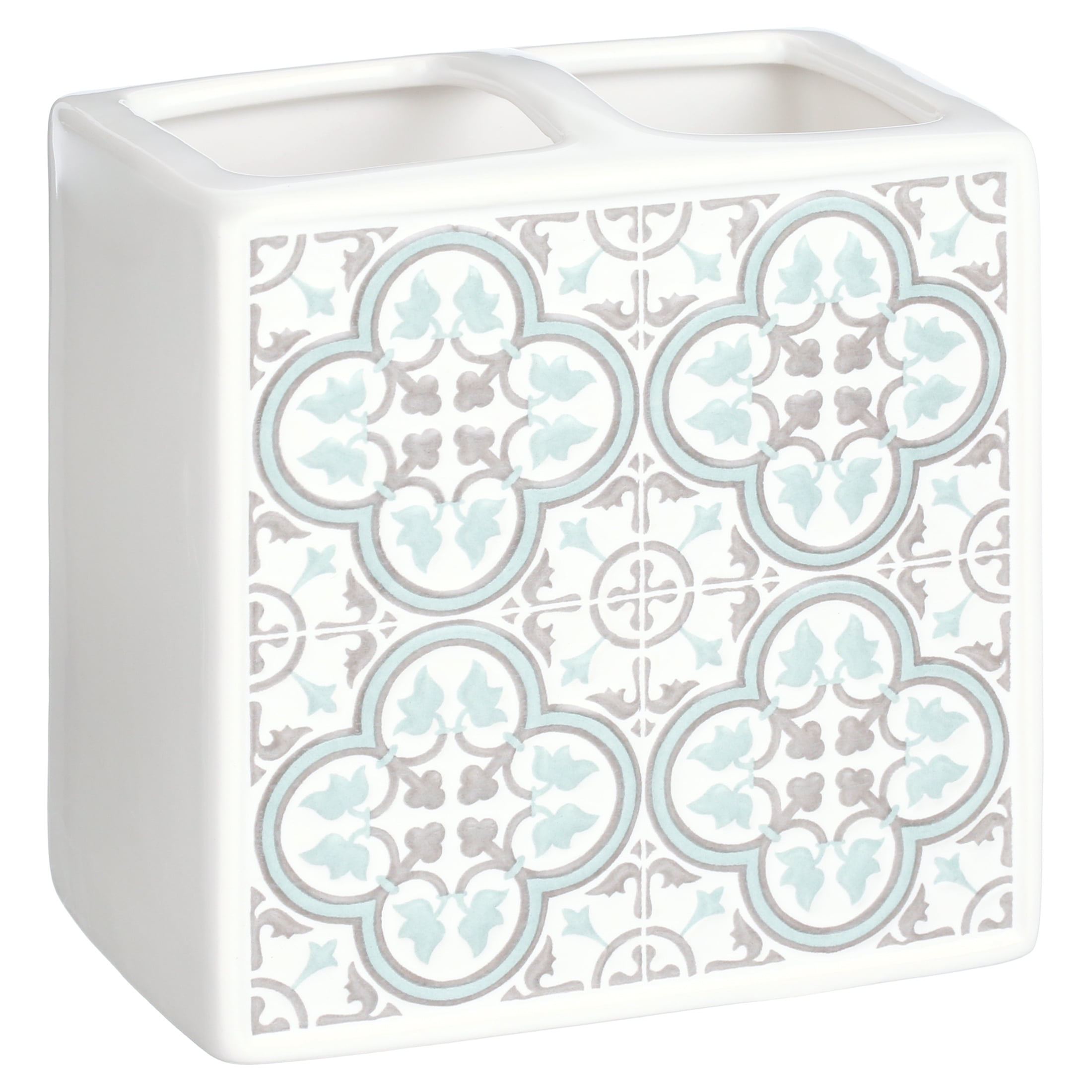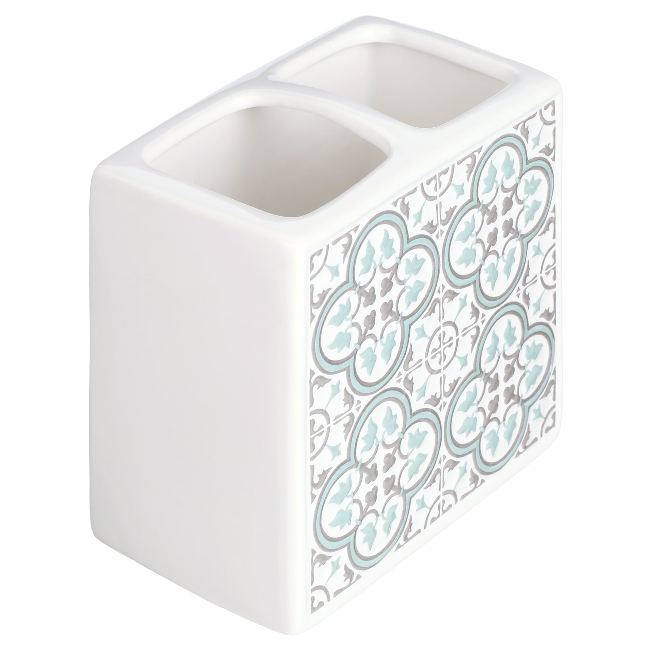 Add a touch of bohemian style to an everyday hygienic need with Mainstays Arbor Leaves Toothbrush Holder. Graced with a textured, medallion pattern this toothbrush holder sparks interest on a bathroom counter. The geometric details are enhanced with cool greys and teals. Smooth white sides bring forth a refined look making this style a staple all year long. Keep your toothbrushes stored neatly and away from hidden countertop germs. With two wide openings, this toothbrush holder is ideal for families. Avoid toothbrushes lying on a bathroom counter where germs may lay. Made of 100% ceramic for a sleek look and stability on a bathroom countertop. Enjoy this toothbrush holder for years to come with its durable, easy to care for design. To care for this toothbrush holder simply wipe clean with a damp cloth. Keep your bathroom dressed in this geometric pattern with the Mainstays Arbor Leaves collection (each sold separately).
