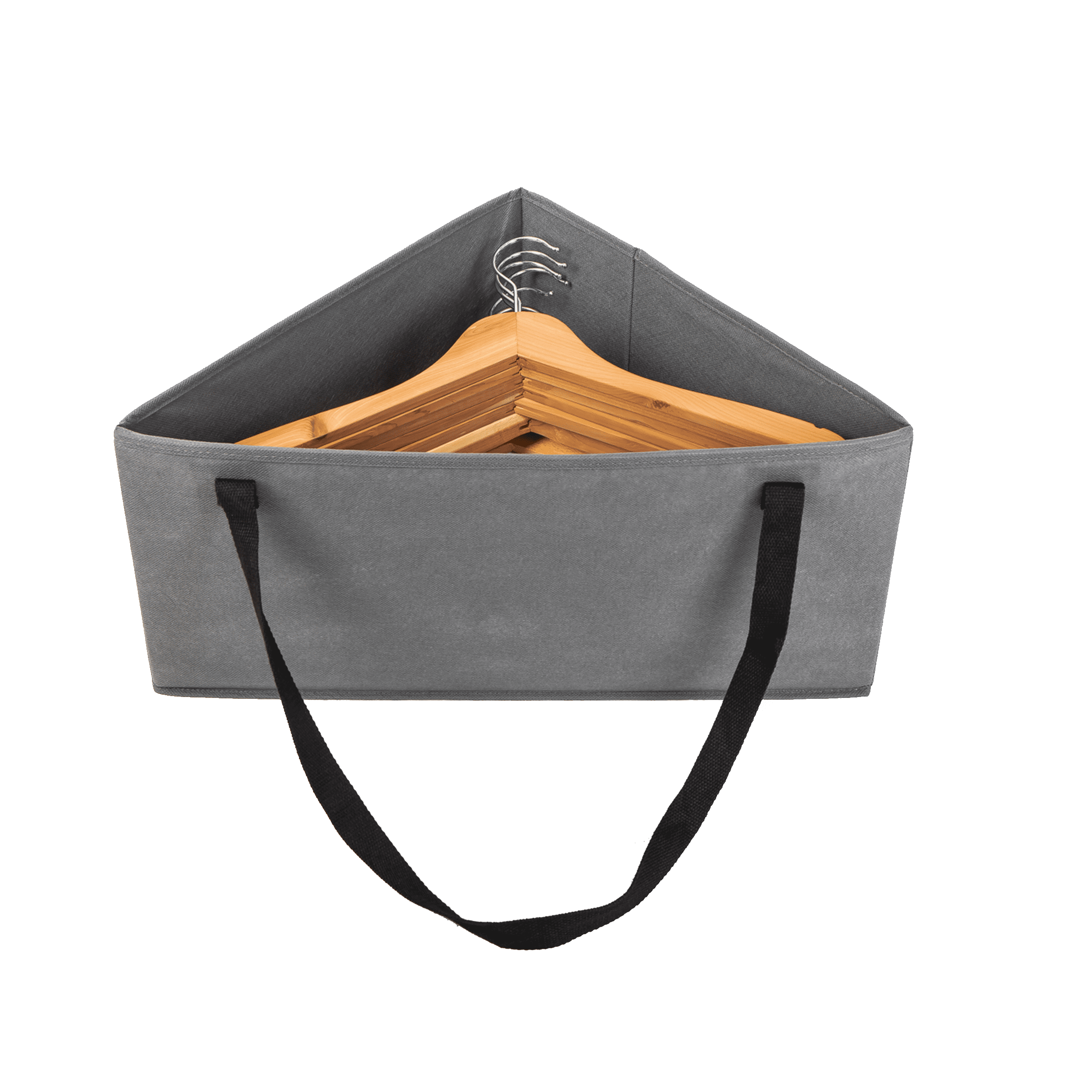 The Mainstays Hanger Hamper in gray organizer allows you to neatly stack unused hangers, meaning less mess in your closet and more room for your clothes. Keeps your hangers neat and organized. This enables you to quickly grab a hanger when needing one. The Mainstays Hanger Hamper Organizer is a must have for every well organized laundry room or closet. Holds wire and plastic hangers. This organizer is easy to fold and store when not in use.