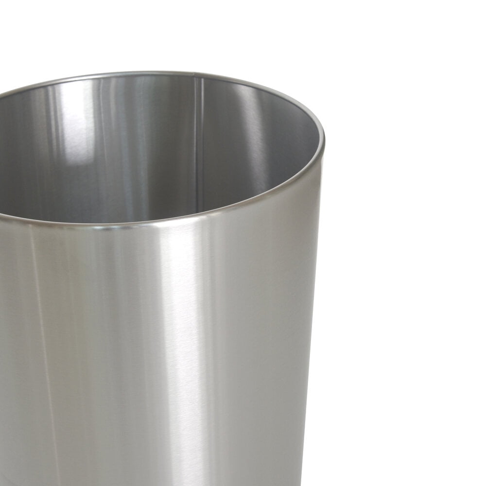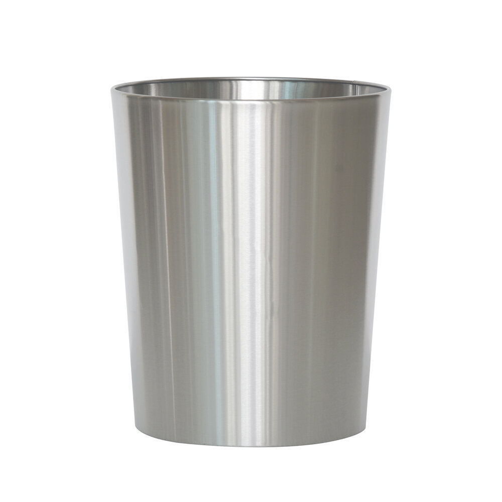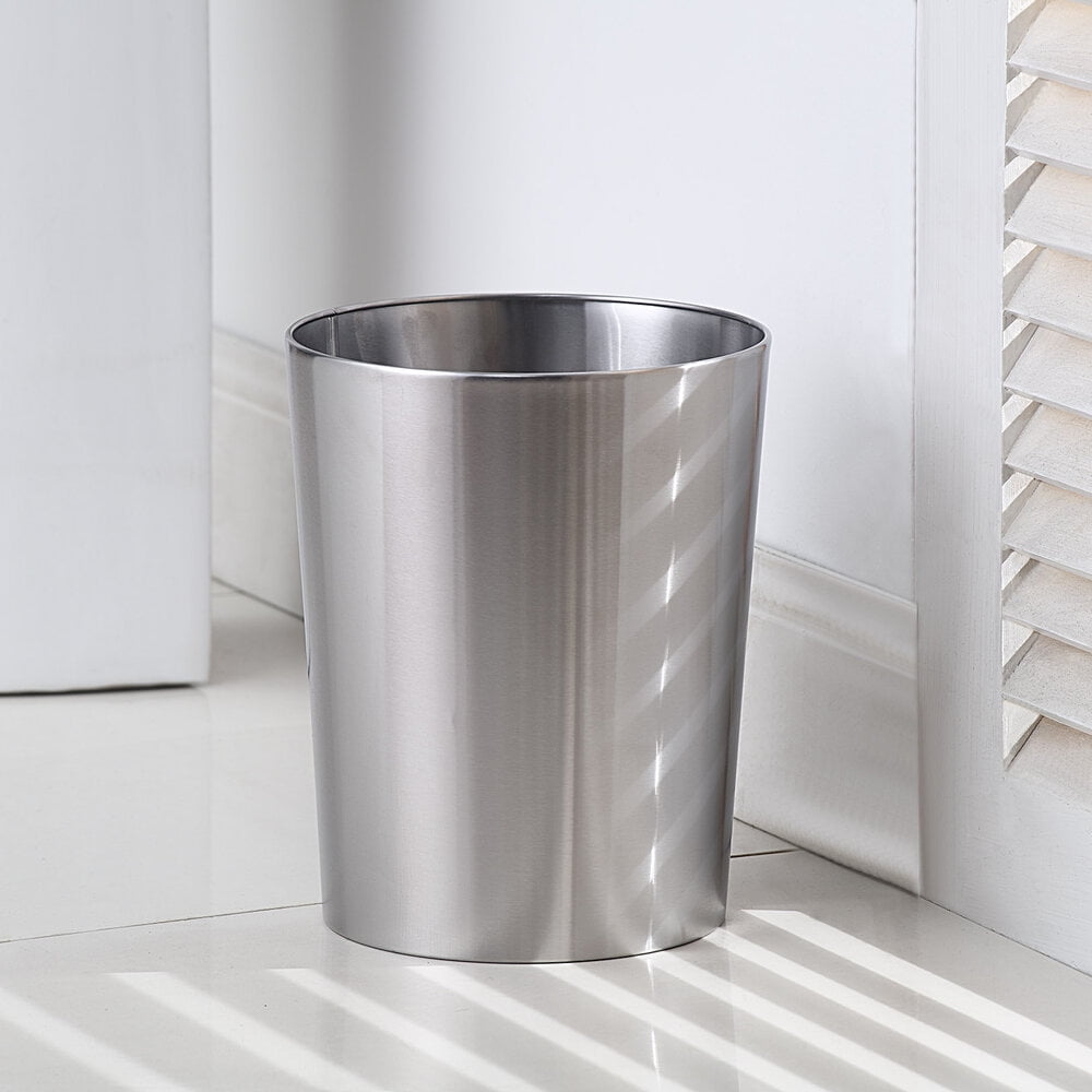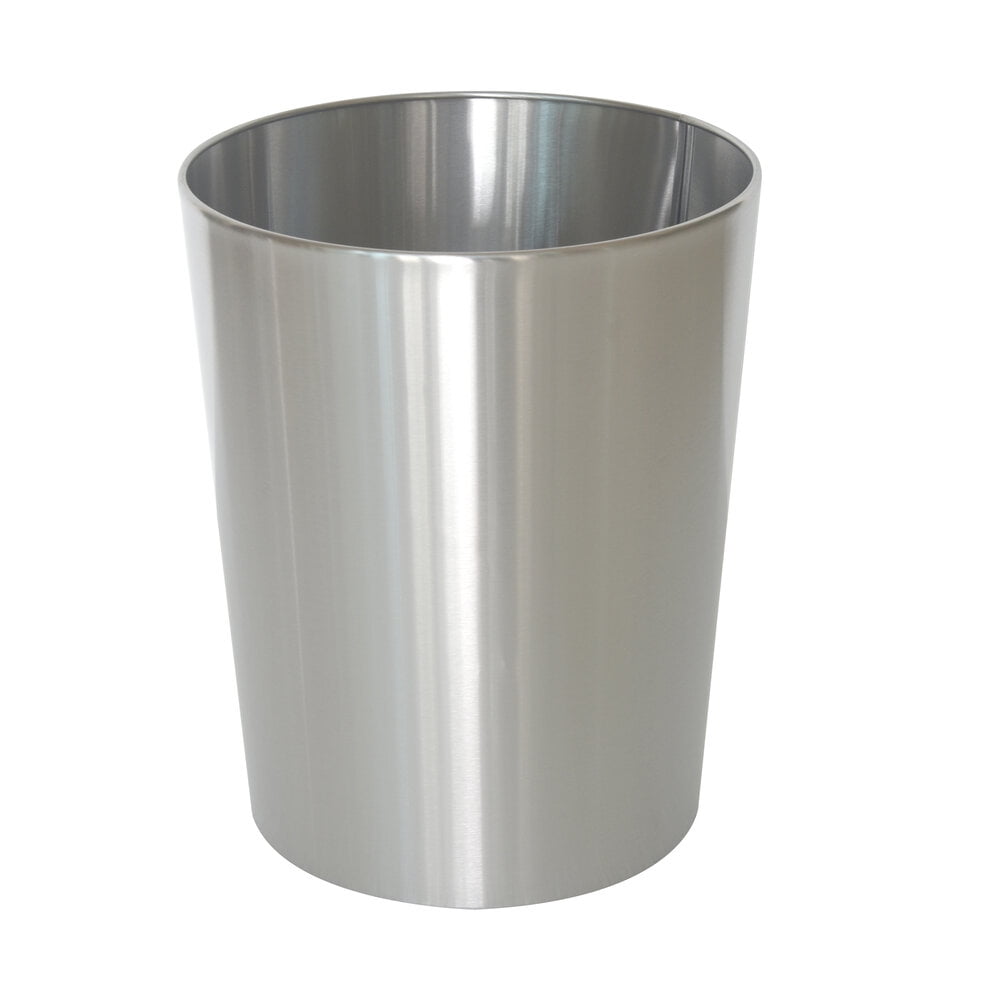 - Metal waste basket features a brushed silver finish and has a sleek, simple design