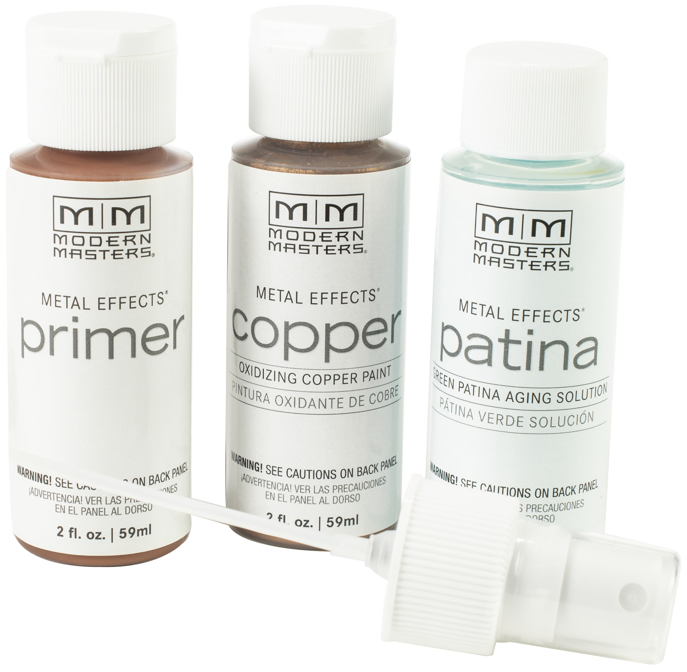 Transform any prepared and paintable surface in a matter of minutes. Great for indoor use and durable enough for outdoor use, each kit contains everything needed to create a distinctive and timeless look. This 2.75×5.25 inch package contains two oz bottle of primer, two oz bottle of oxidizing paint, two oz of activating/aging solution, and one spritzer cap attachment. Available in multiple colors; each sold separately. Chip brushes and cloth rags are required but not included. WARNING: Choking Hazard. Not suitable for children under 3 years. Imported.Modern Masters Metal Effects Oxidizing Finish Kit-Green Patina