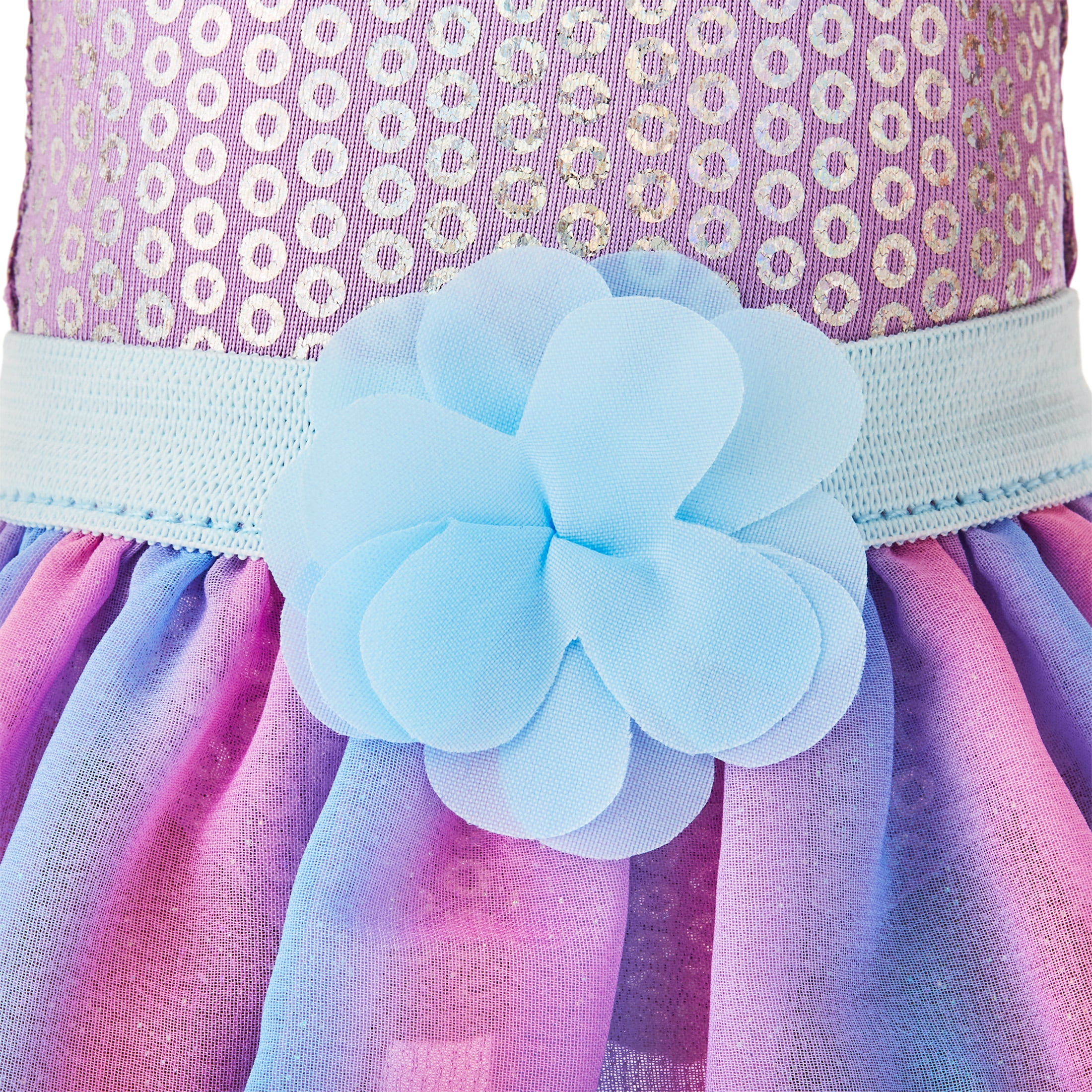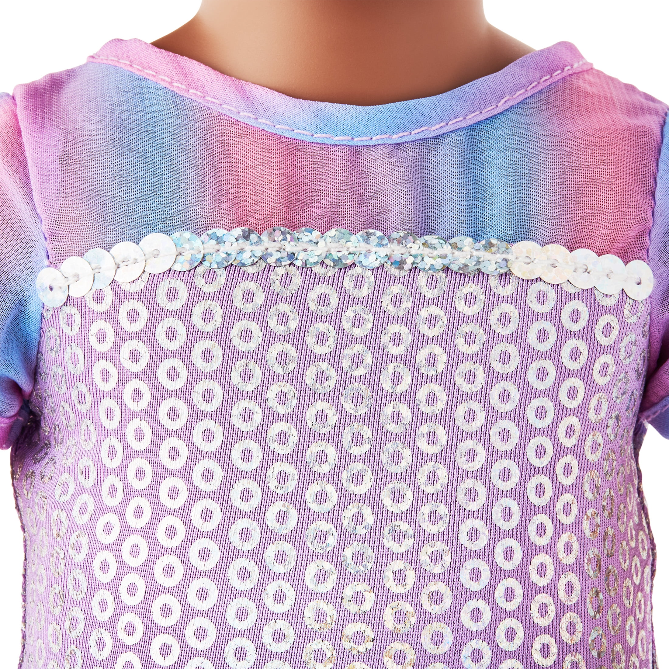 - Features a shimmery skirt and sequined top