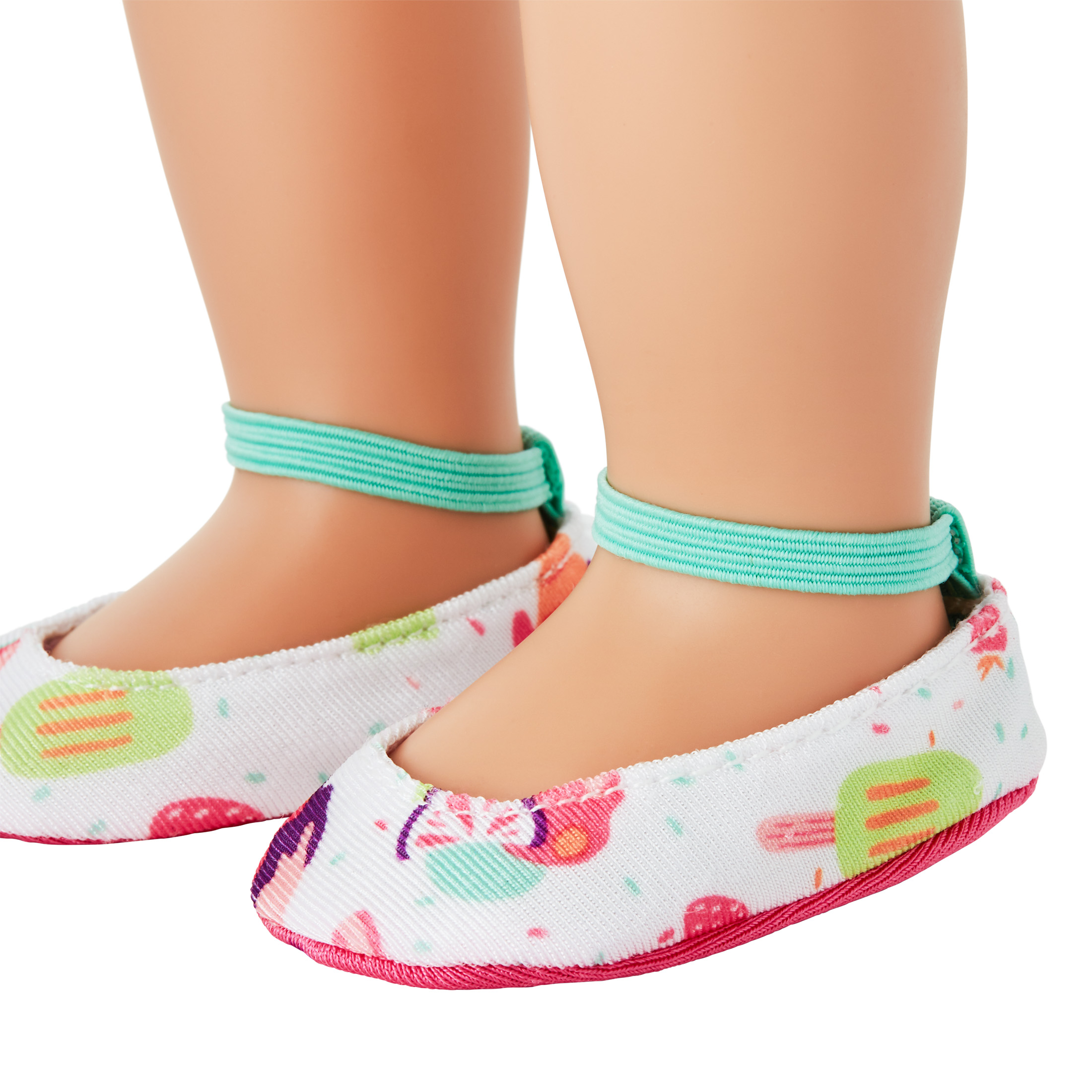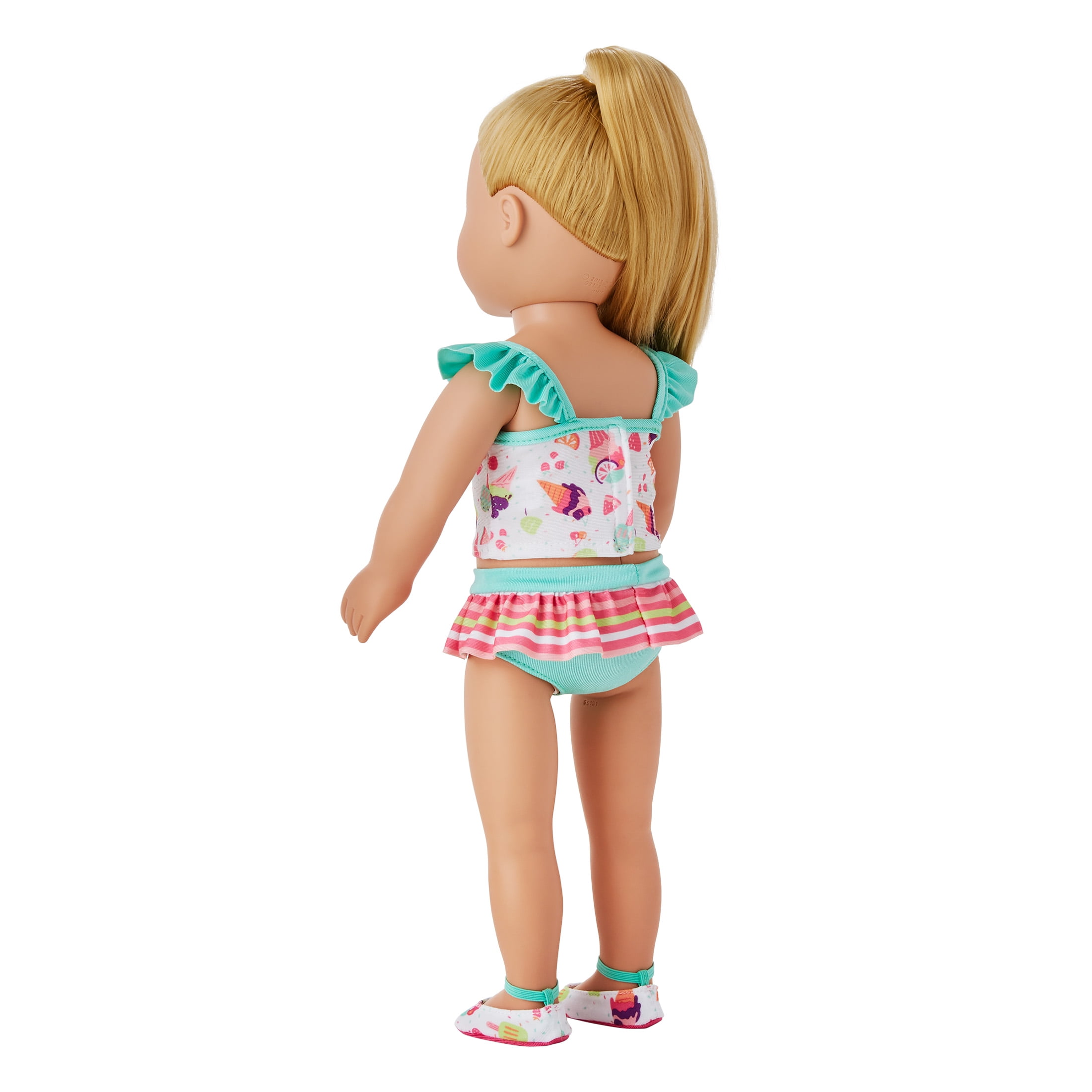 No pool party is complete without a swimsuit as fun as the attendees! The My Life As Pink & Blue Ice Cream Swimsuit includes a one-piece swimsuit with ruffles and an ice cream pattern, as well as a pair of swimming shoes and retro circle sunglasses. Whether it’s the beach or poolside, the 18”doll will be ready to swim in the sun with the My Life As Pink & Blue Ice Cream Swimsuit! 18” doll not included.