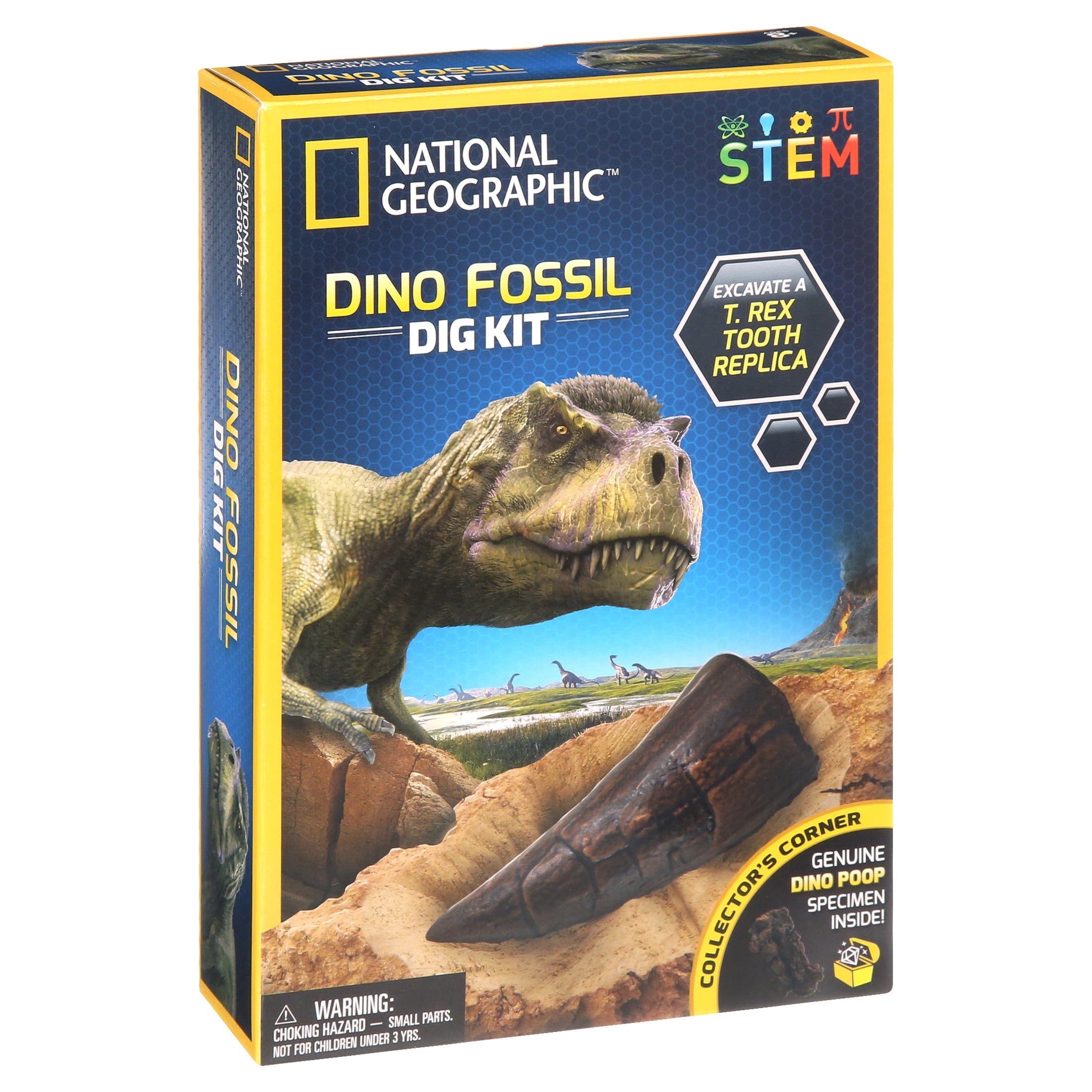 Kids will discover 3 real dinosaur fossils! Dig up a dinosaur bone, mosasaur tooth, and dinosaur poop for your rock collection Children become immersed in the prehistoric era and will discover amazing dinosaur facts with National Geographics full-color learning guide Become a paleontologist! This interactive archeological dig lets kids experience the thrill of discovery! Just like unwrapping a gift, your child will love uncovering these real fossils and starting a rock and fossil collection Providing children with the best educational toys, this kit is backed by National Geographic’s 100% satisfaction guarantee