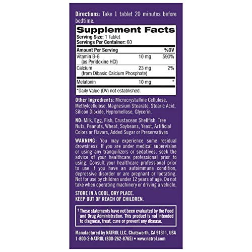 Natrol Melatonin Advanced Sleep Tablets with Vitamin B6, Helps You Fall Asleep Faster, Stay Asleep Longer, 2-Layer Controlled Release, 100% Drug-Free, 10mg, 60 Count