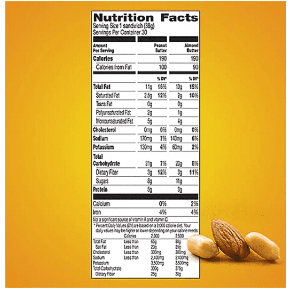 - 5 grams of protein in each peanut butter sandwich and 3 grams of protein in each almond butter sandwich