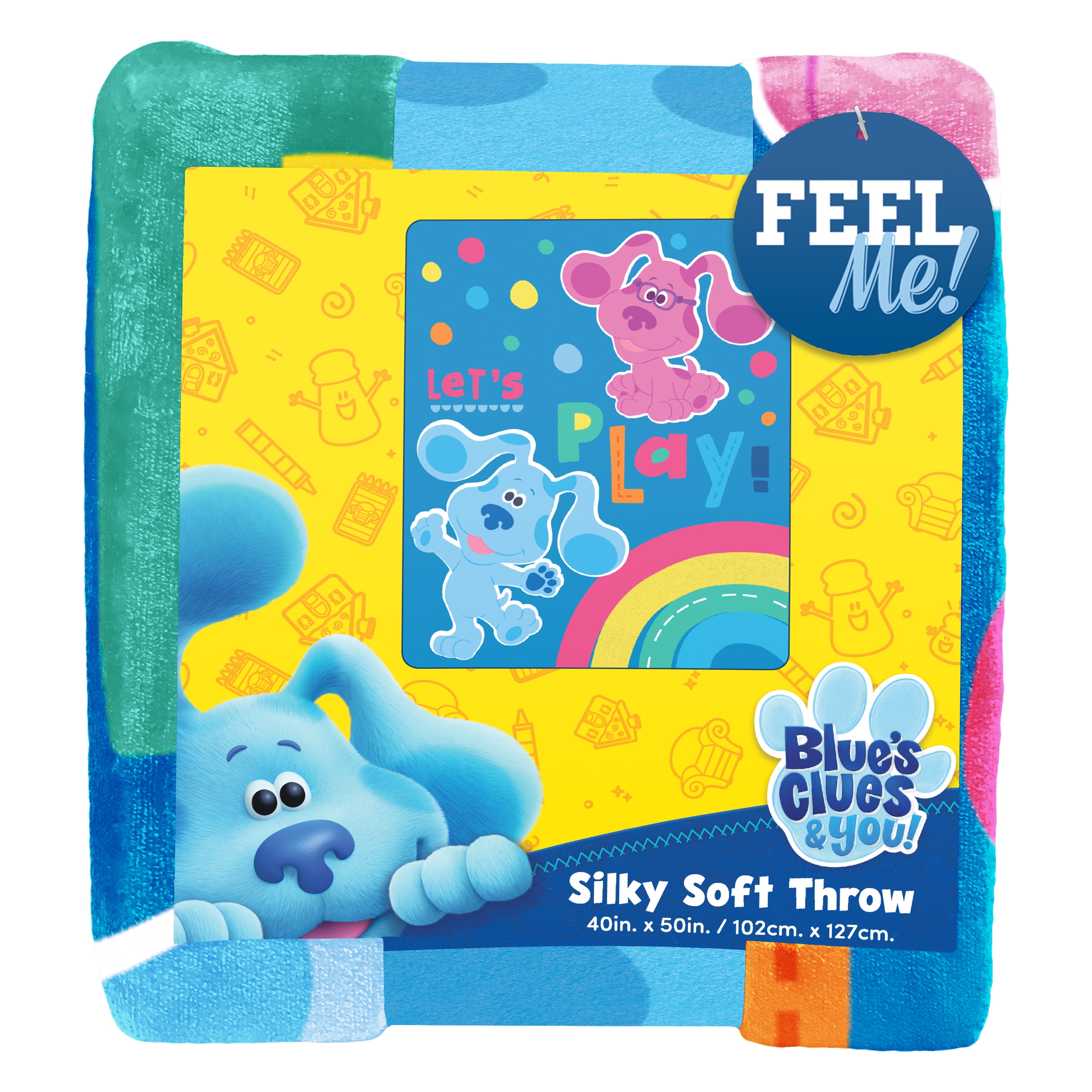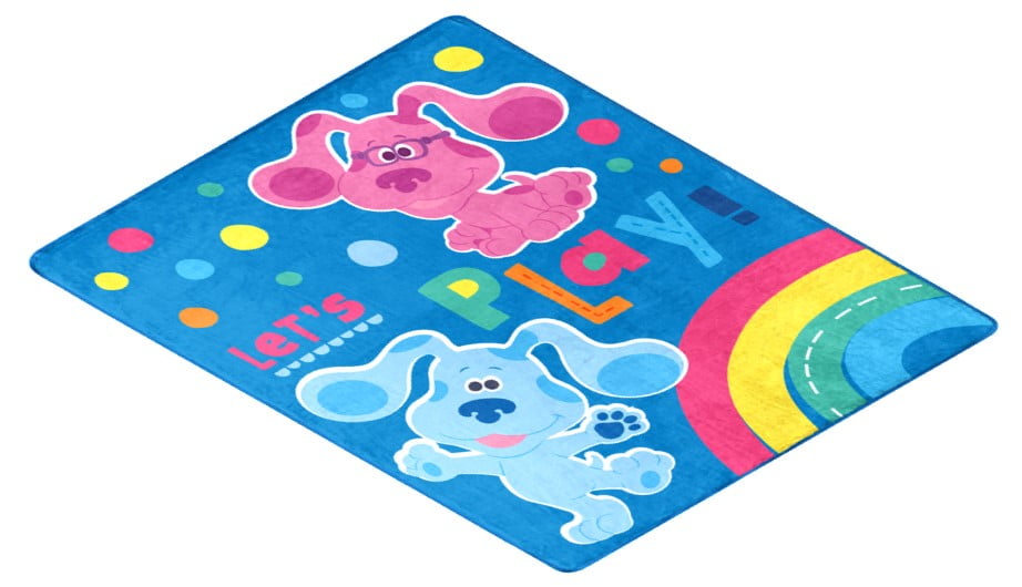 Cozy up in this fun officially licensed Nickelodeon Blues Clues "Let’s Play" silk touch throw blanket by The Northwest Group. Featuring Blue and Magenta ready to play on a blue polka dot background, this 40"x 50" throw is silky soft and warm, with decorative binding around the edges. Use it in the bedroom, cuddle under it in the living room while watching your favorite movie, or take it on the go with you.