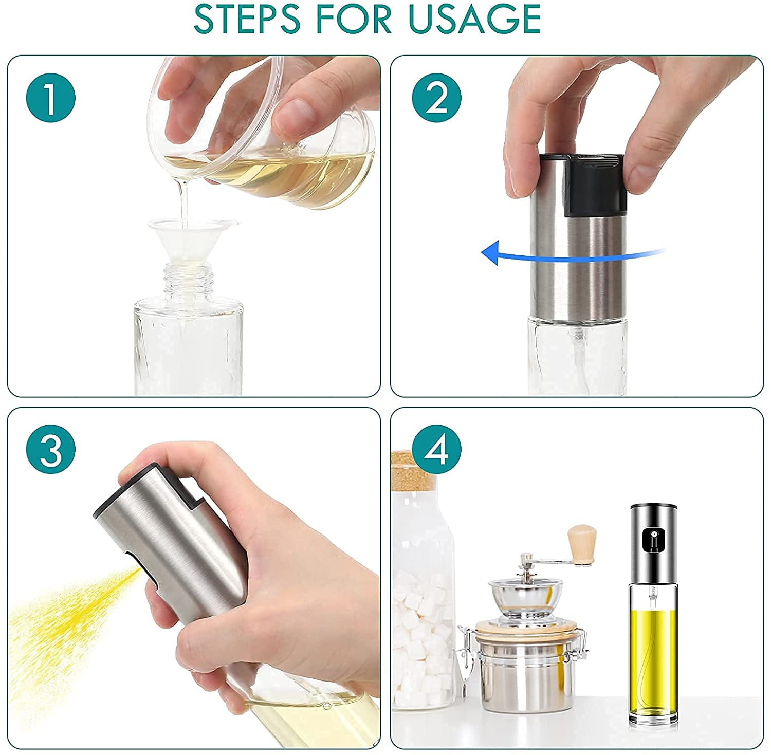 Premium 304 stainless steel top design and 100ml food-grade transparent glass bottle.The oil sprayer is completely BPA-free and eco-friendly.Send a funnel
