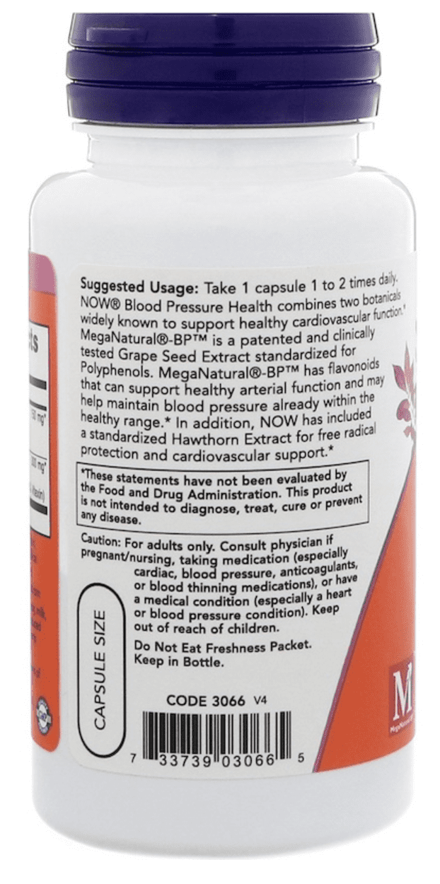 NOW Blood Pressure Health combines two botanicals widely known to support healthy cardiovascular function. MegaNatural-BP is a patented and clinically tested Grape Seed Extract standardized for Polyphenols. MegaNatural-BP has flavonoids that can support healthy arterial function and may help maintain blood pressure already within the healthy range. In addition, NOW has included a standardized Hawthorn Extract for free radical protection and cardiovascular support.