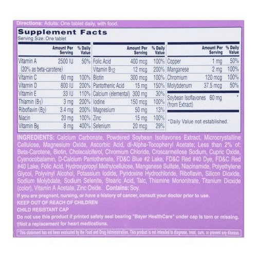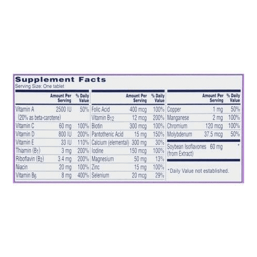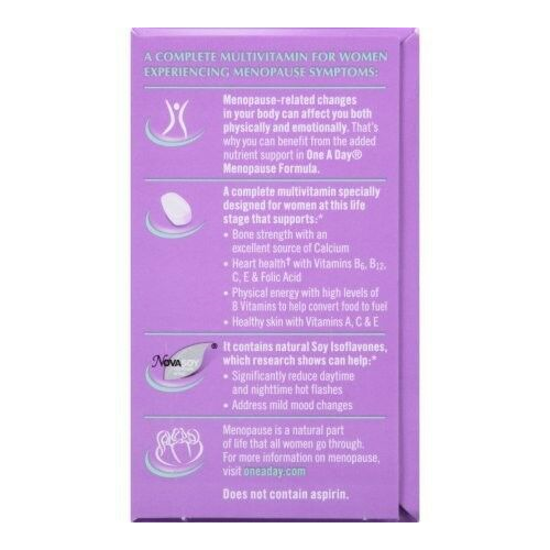 Menopause-related changes in your body can affect you both physically and emotionally. That’s why you can benefit from the nutrient support in a One A Day® Menopause Formula. One A Day Women’s Menopause Formula offers key benefits in a convenient tablet. One A Day Menopause Formula is a complete multivitamin with natural Soy Isoflavones to help address some menopause-related symptoms such as hot flashes and mild mood swings. One A Day Menopause Multivitamin offers key nutrients to help support bone health. This daily multivitamin contains Vitamins A, B6, B12, C, D and E, Soy Isoflavones, Thiamin, Niacin, Riboflavin, Folic Acid, Pantothenic Acid, Calcium, Magnesium, Zinc, Copper, Manganese, Molybdenum, Biotin, Iodine, Selenium and Chromium. One A Day Women’s Menopause Formula is formulated to support menopause symptoms, bone health, physical energy by helping convert food to fuel, skin health and heart health. Adult women should take one tablet with food. One a Day Multivitamins can provide nutritional support that you and your family may need at every life stage.