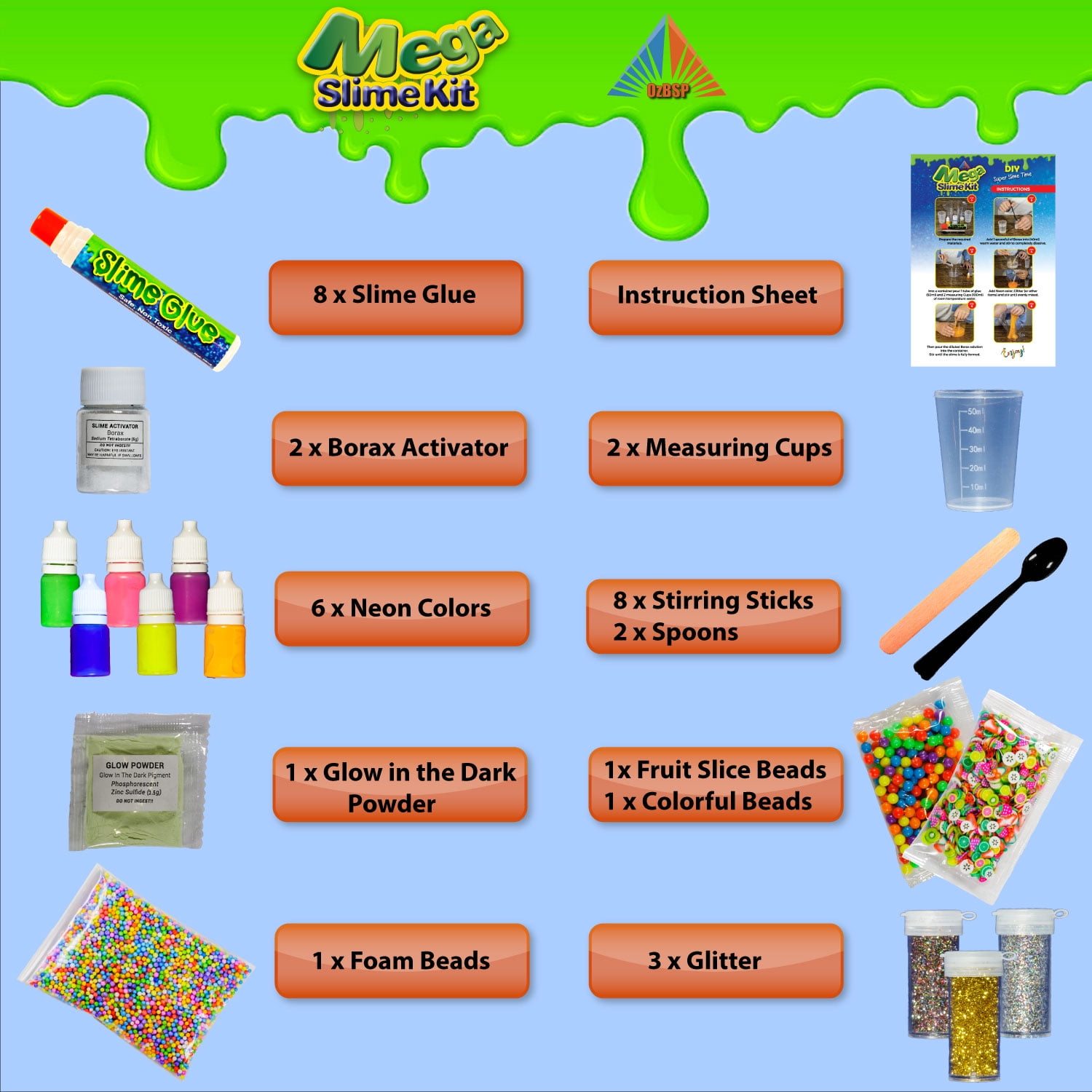 - STEM SCIENCE KIT:with everything you need to make 8 large batches of Slime. Kit includes 6 neon colors, 3 types of glitter, 1 bag of round beads, 1 bag of Fruit Slice beads, 1 bag of Foam beads, 1 bag of Glow in the Dark powder, 8 tubes of non-toxic glue, 2 containers of Borax, 2 measuring cups, 2 measuring spoons, 8 stirring sticks and new detailed instructions