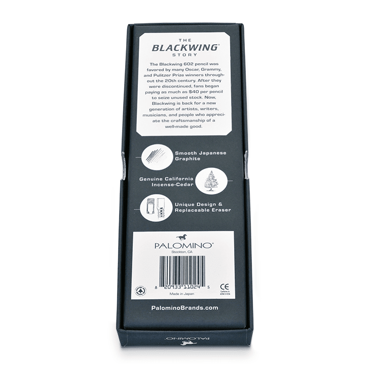 With a retro look that is decidedly fresh, the Palomino Blackwing pencil pays tribute to the grand-daddy of legendary pencils, the Eberhardt-Faber Blackwing 602. Blackwing pencils have sketched, written and composed their way across the American cultural landscape. This soft and smooth graphite core is the ideal gift for artists, musicians or anyone who sometimes seeks a more natural existence.