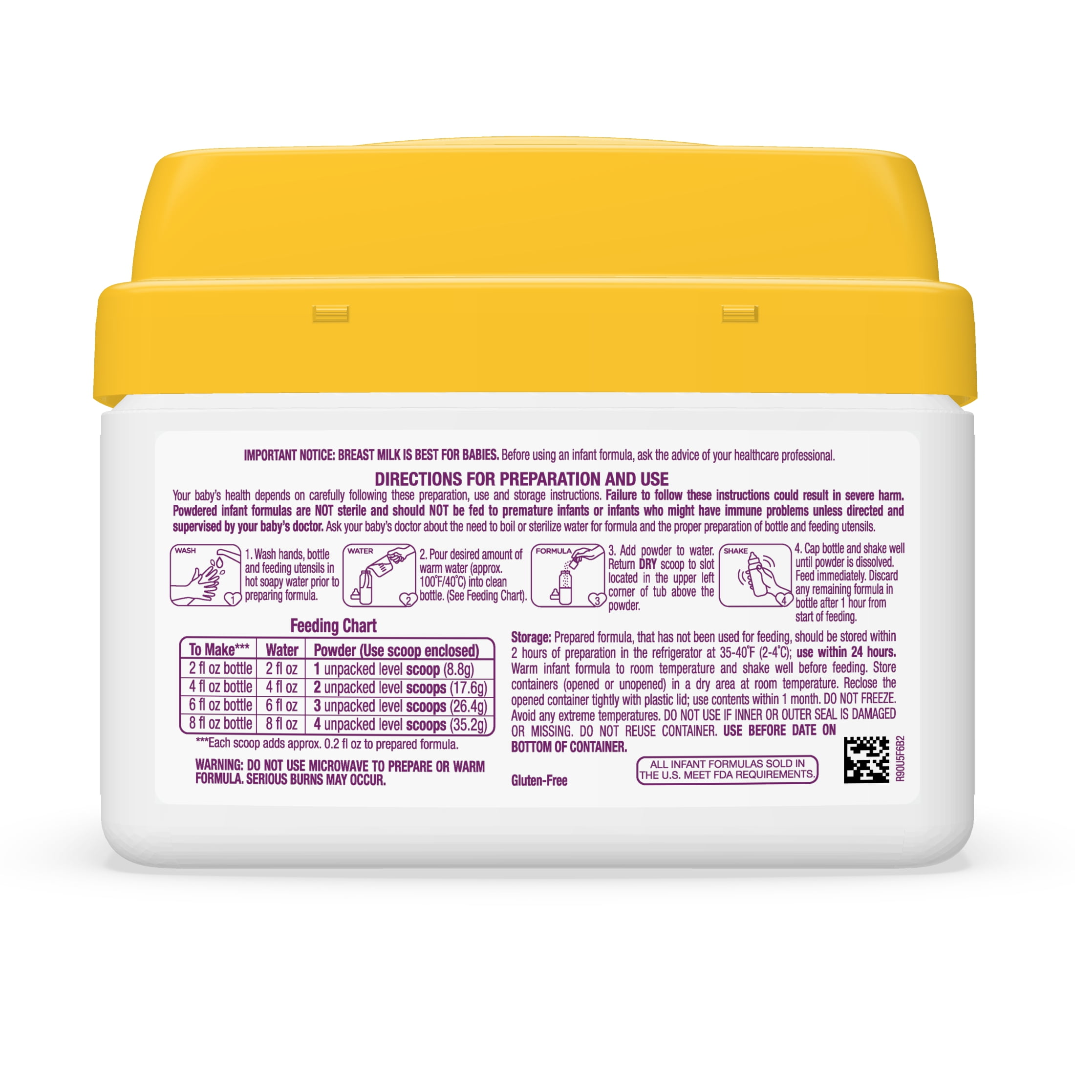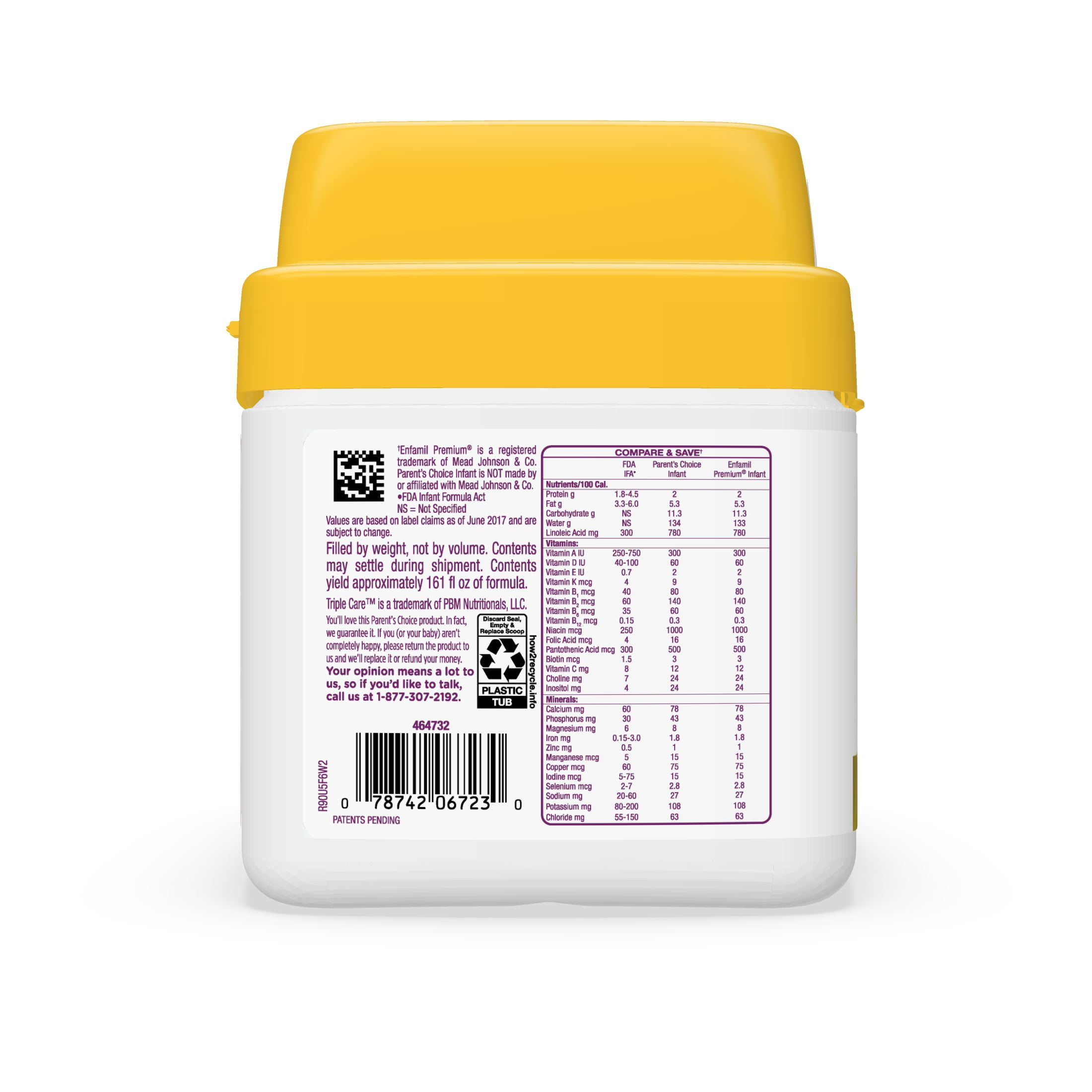 Compare to Enfamil Premium Infant. Your baby is growing and changing every day. Parent’s Choice Infant Milk-Based Baby Formula Powder with Iron is designed to be closer to breast milk than our previous formulation for complete nutrition during baby’s important first year. This formula powder contains two prebiotics to help support baby’s immune health, DHA and Choline to help support brain development, plus 30 more nutrients to give your baby a strong start. No artificial flavors, sweeteners or colors; non-GMO ingredients not genetically engineered. Gluten free and certified kosher by the Orthodox Union – (U)D. This product is not manufactured or distributed by the owner of the registered trademark Enfamil. The product may contain trace levels of genetically engineered material, such as from process sources and manufacturing environments. No significant difference has been shown between milk derived from RBST-treated and non-RBST-treated cows.