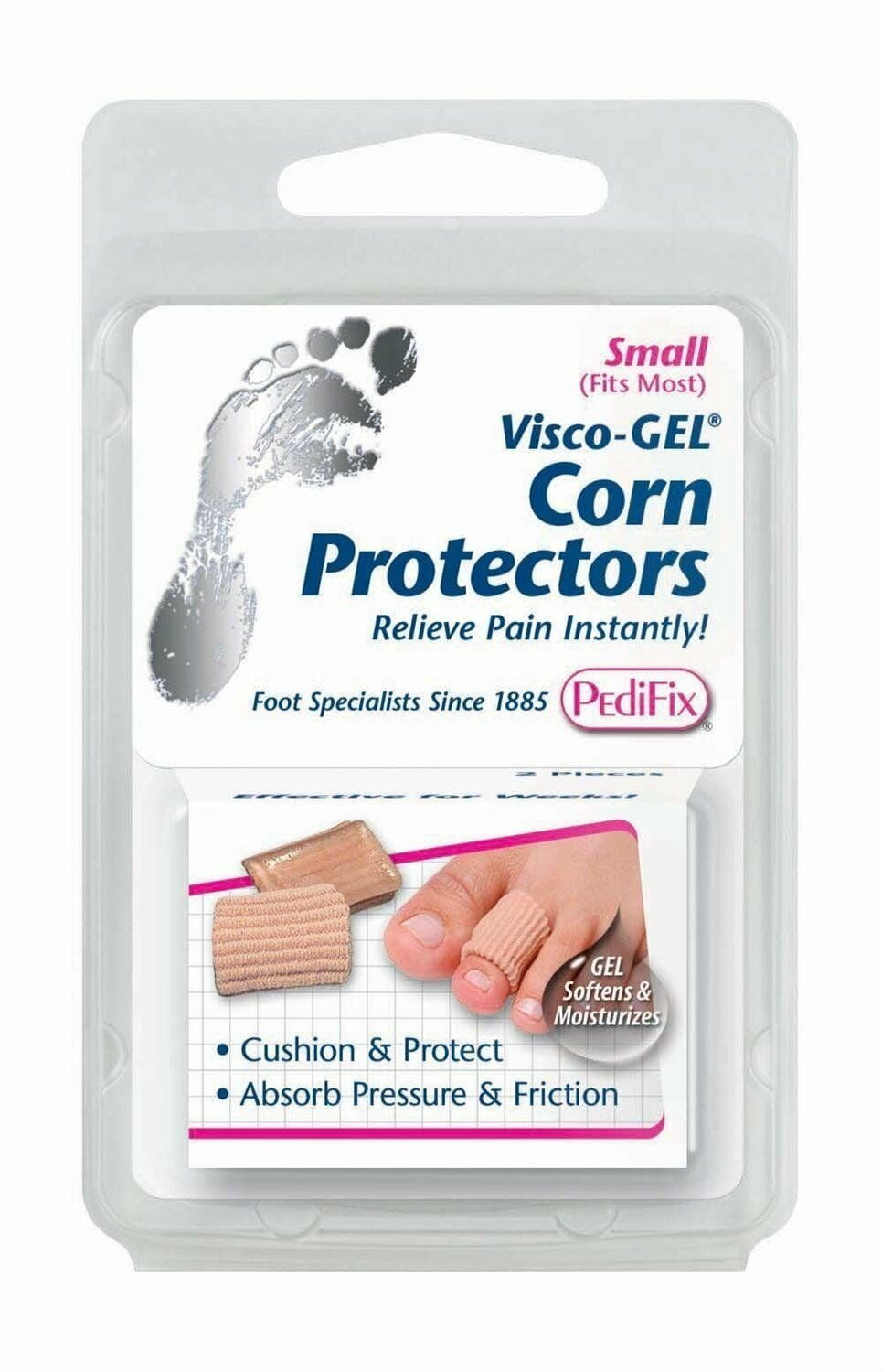 Proprietary Gel absorbs pressure and friction, protects, soothes and softens corns. Visco-GEL releases mineral oil enriched with vitamin E to moisturize skin. Soft’N Stretch Fabric Sleeve keeps Gel in position without adhesives. 2 per pack.