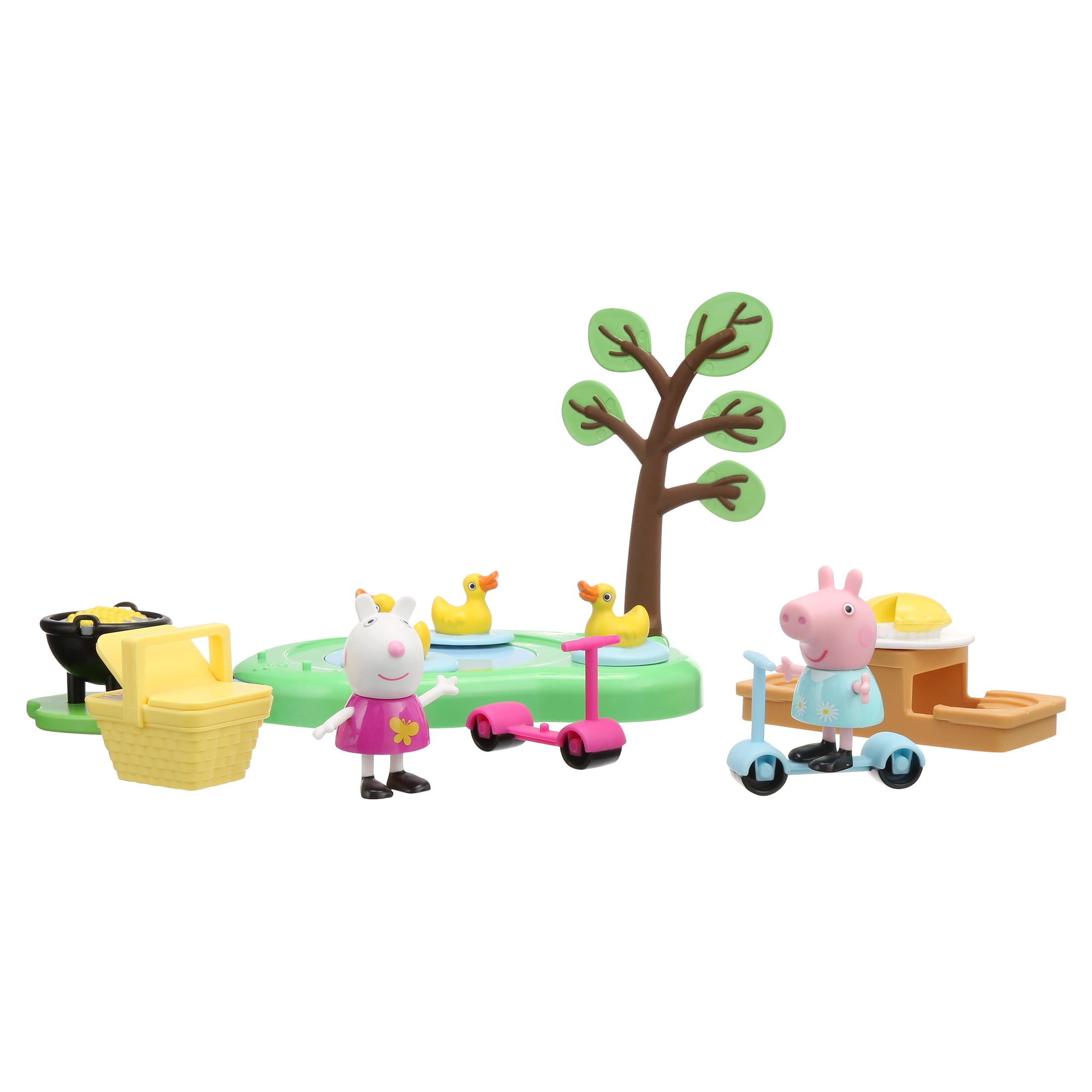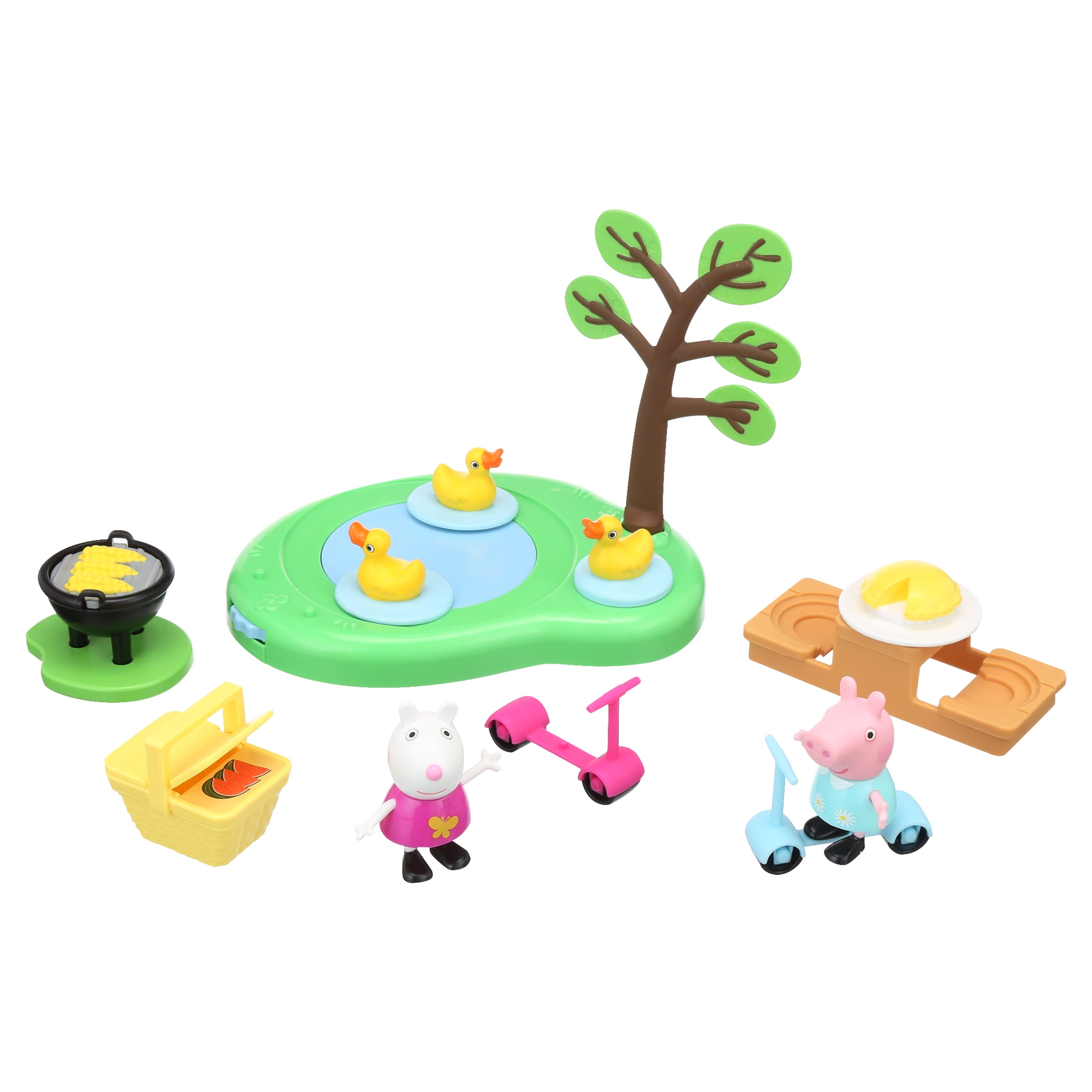 - 10-PIECE PICNIC PLAYSET: Preschoolers can play out picnic stories with the included 2-piece duck pond, picnic basket, picnic table, pie, grill, 2 scooters, and 2 figures
