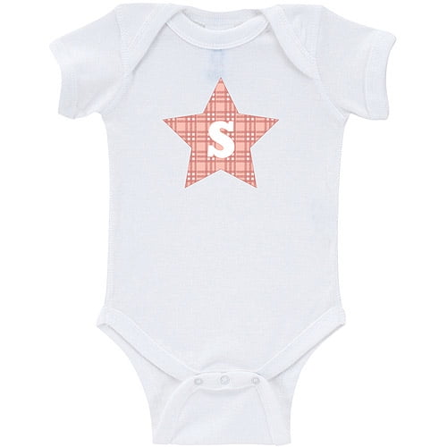 This super-comfy creeper features a peach colored plaid star design highlighted by her initial. She’ll be the star of the playroom when you add a name.