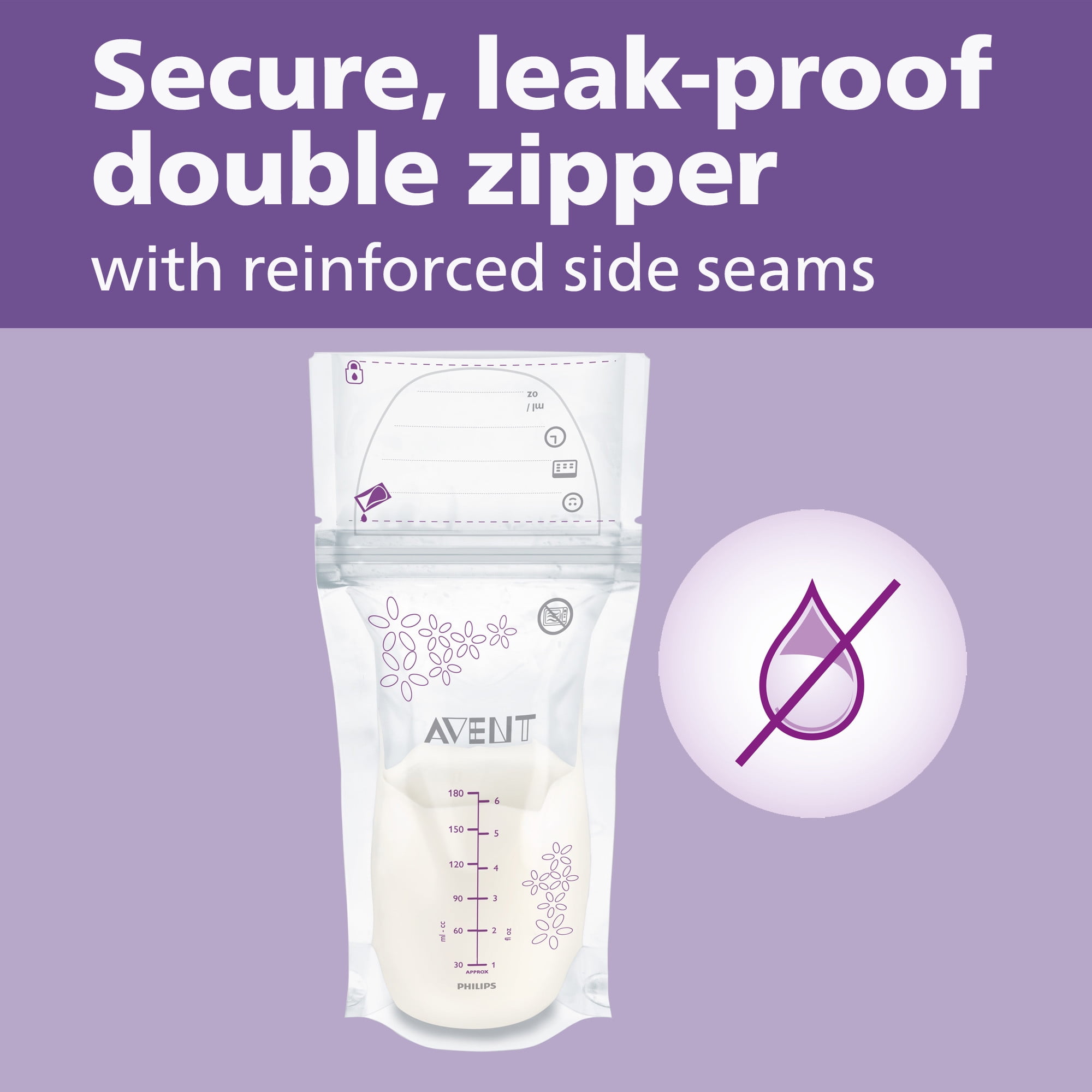 Philips Avent Breast Milk Storage Bags protect and safely store your precious breast milk. With reinforced side seams and dual layer bag, they are strong and durable, and the double zipper ensures no leaks. They are pre-sterilized for immediate use and the self-standing bag is easy to use with a wide neck for easy filling and pouring. At the top of the bag you can note the date and time of the milk expression for easy breast milk storage management. You can use them for storage in the in the fridge or freezer. Includes 50 pre-sterilized bags. Model number: SCF603/50 What’s in the box: 50 Breast Milk Storage Bags