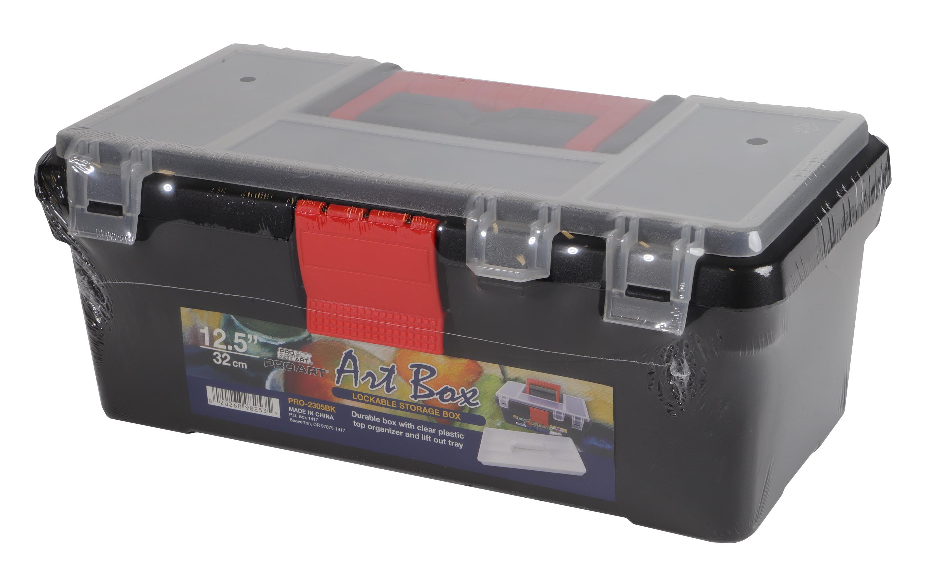 Pro Art Art Box 12.5" Black- Lockable storage box. Durable body with clear plastic top organizer and lift out tray. Black body with red handles and hinges. Measures approximately 12.5"x 5.25"x 7.25".Pro Art Art Box 12.5×12.5" Black