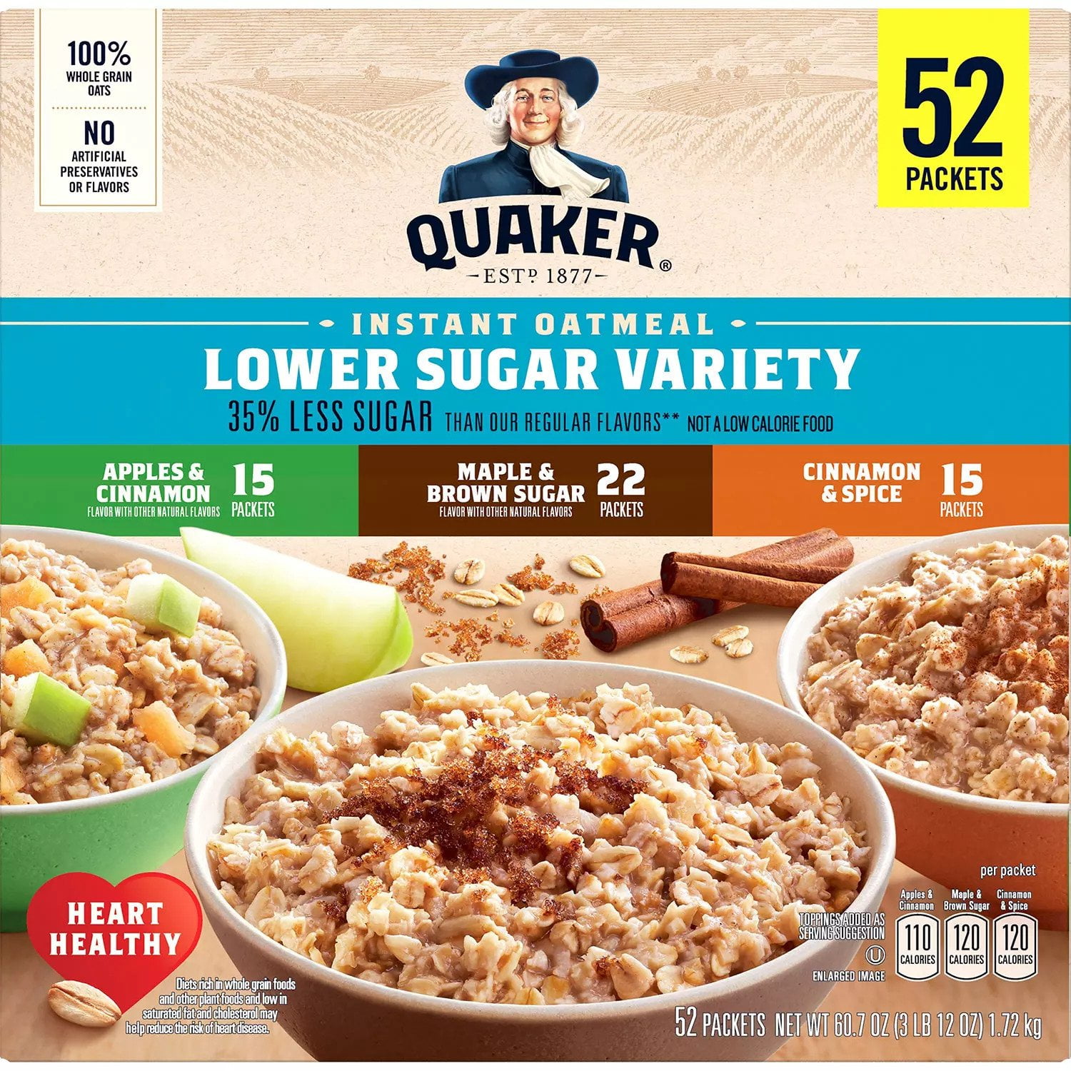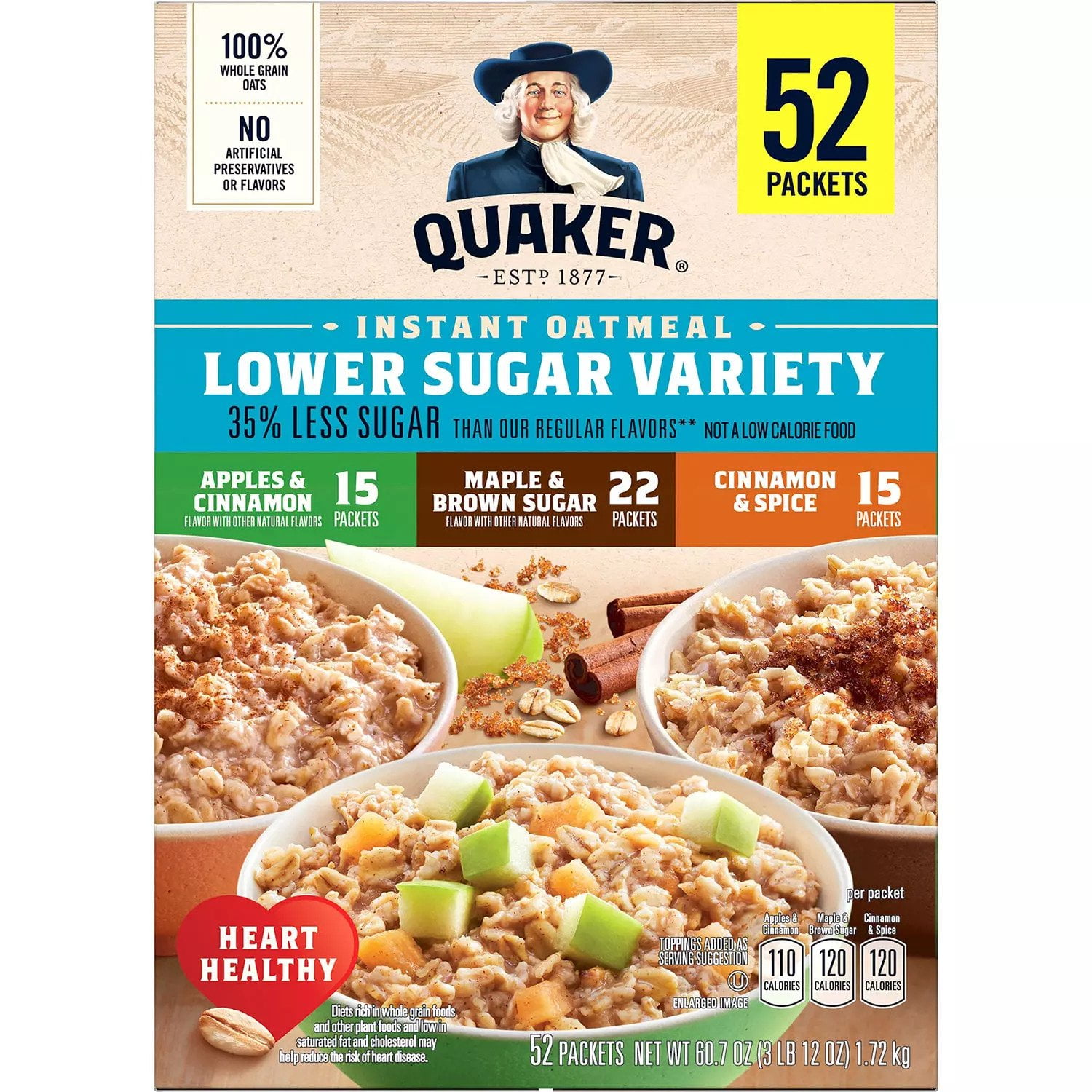 Quaker Lower Sugar Instant Oatmeal, Variety Pack (52 pk.). Made with heart healthy 100% whole grain Quaker Oats. Contains 35% less sugar than our regular flavors. No artificial flavors, preservatives or sweeteners.Quaker Lower Sugar Instant Oatmeal, Variety Pack (52 pk.)