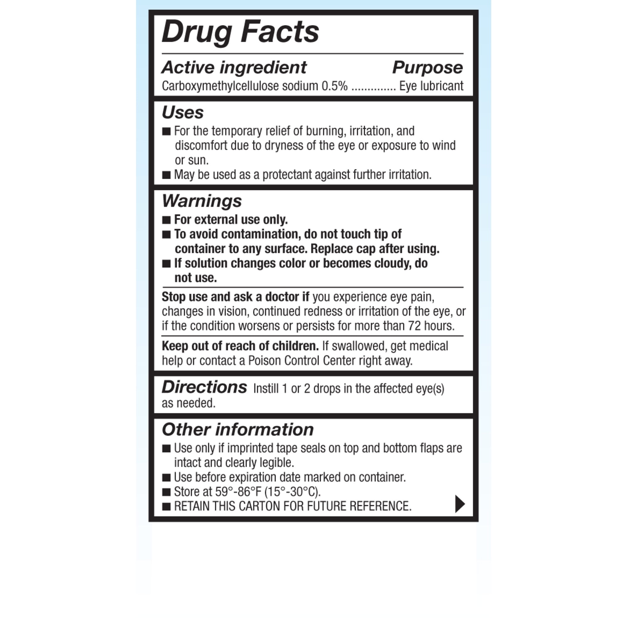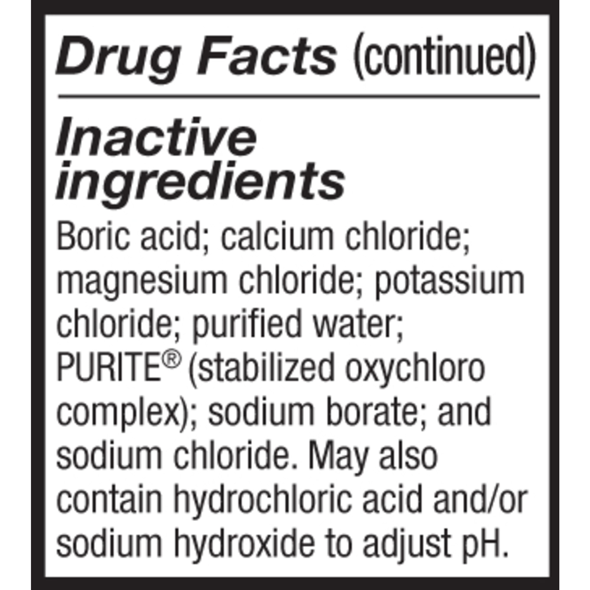 Warnings: For external use only. To avoid contamination, do not touch tip of container to any surface. Replace cap after using. If solution changes color, do not use. Stop use and ask a doctor if you experience eye pain, changes in vision, continued redness or irritation of the eye, or if the condition worsens or persists for more than 72 hours. Keep out of reach of children. If swallowed, get medical help or contact a Poison Control Center right away. Other Information: Use only if imprinted tape seals on top and bottom flaps are intact and clearly legible. Use before expiration date marked on container. Discard 90 days after opening. Store at 59°-86°F (15°-30°C).