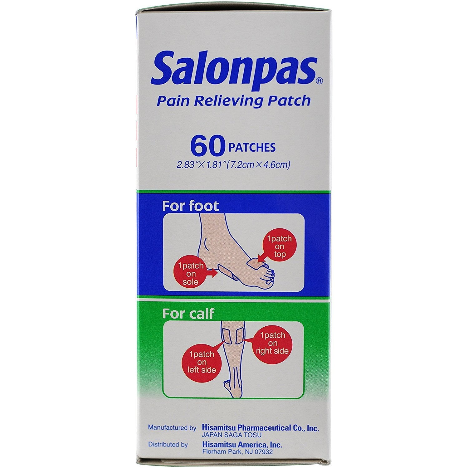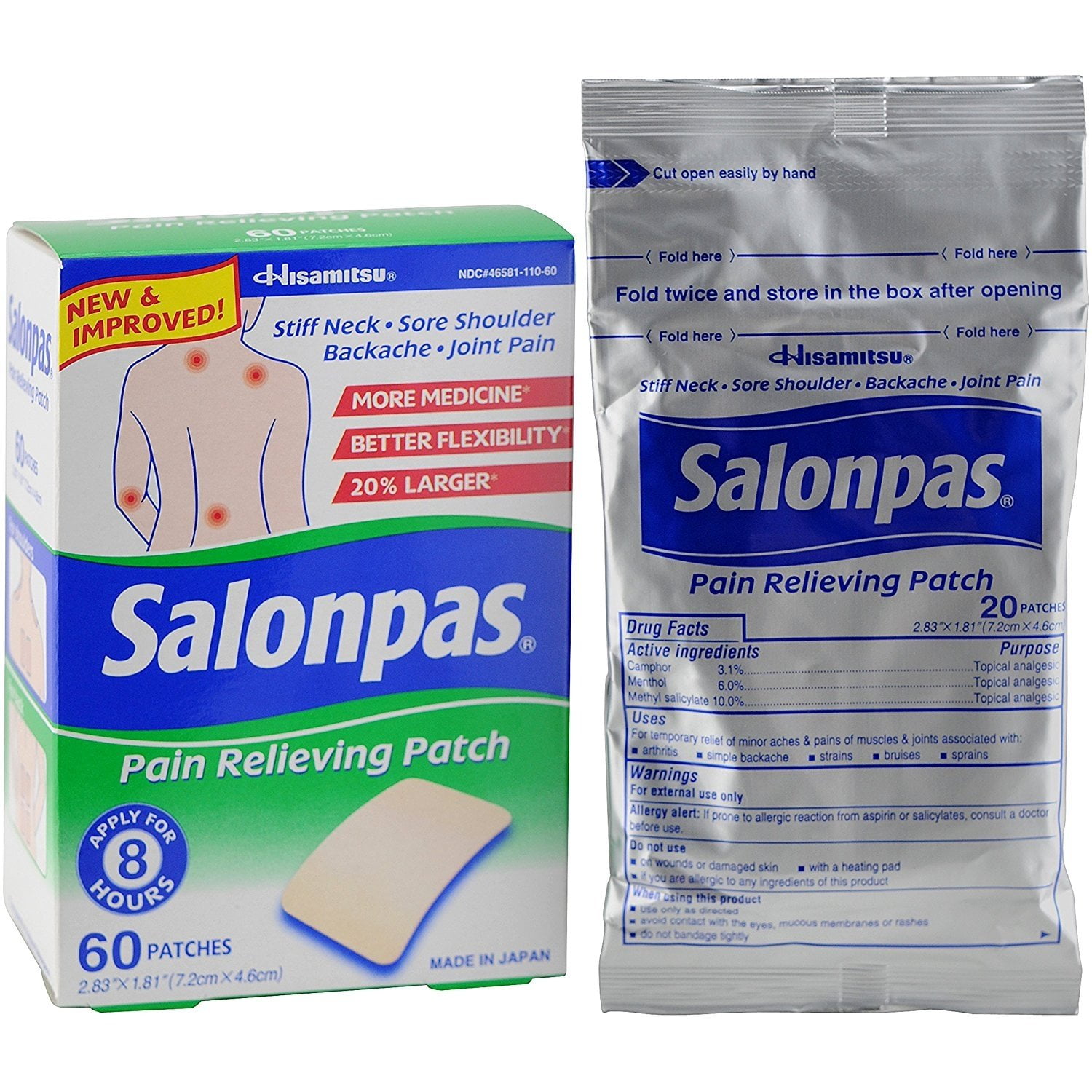 Salonpas offers small pain relieving patches that are 2.83 inches by 1.81 inches. One box contains 60 patches that can be worn for 8 hours. The active ingredients are camphor, menthol and methyl salicylate.