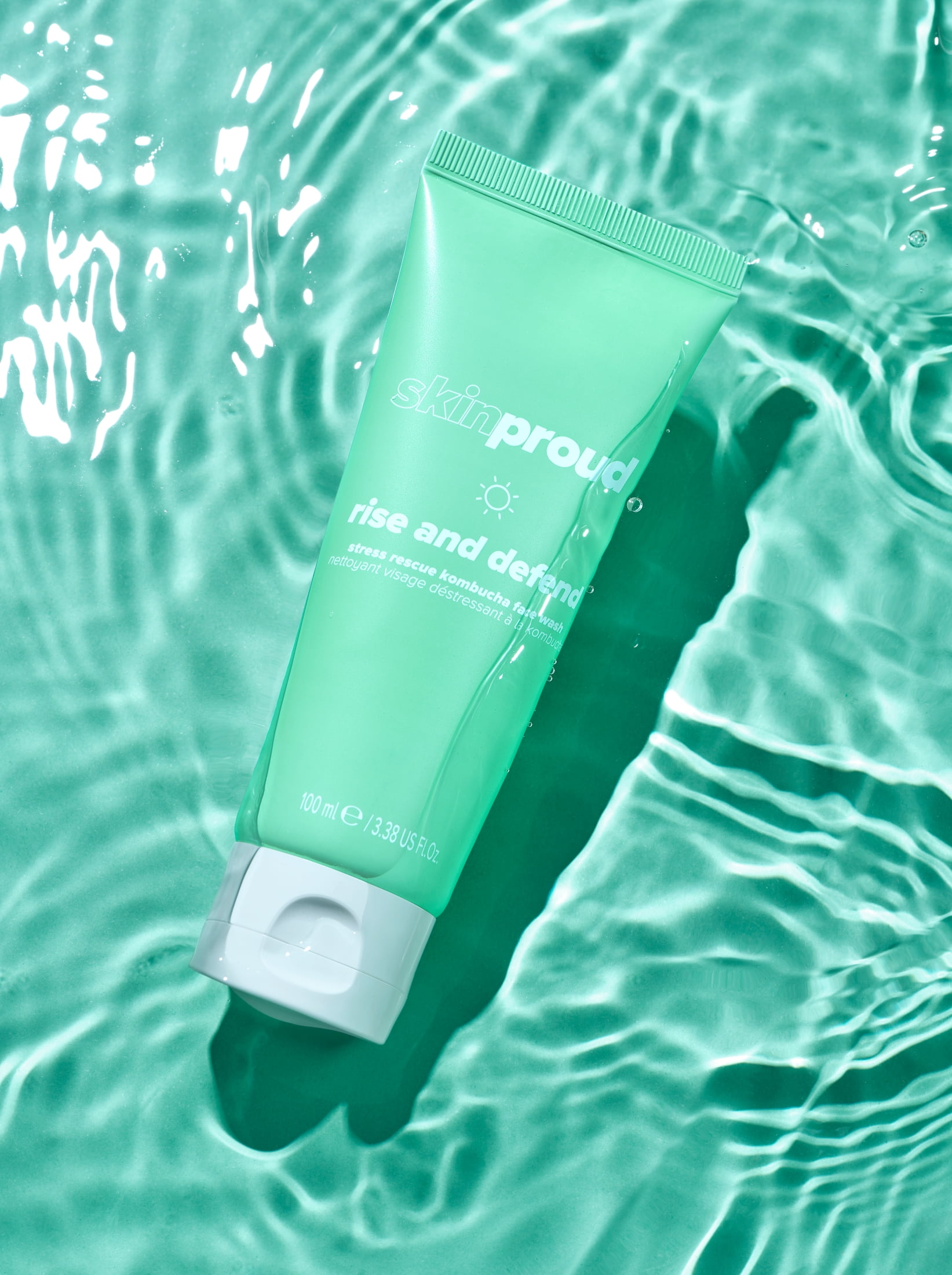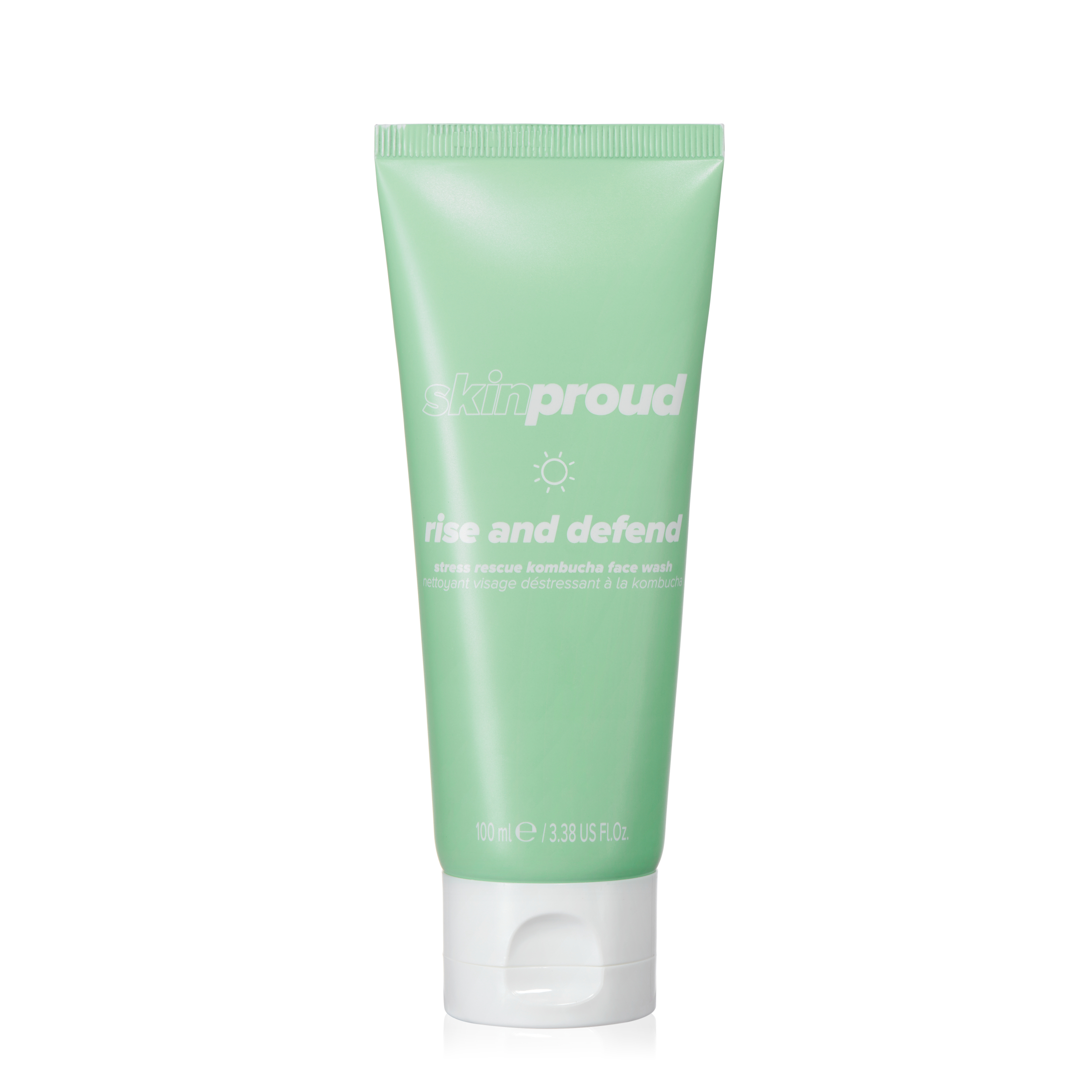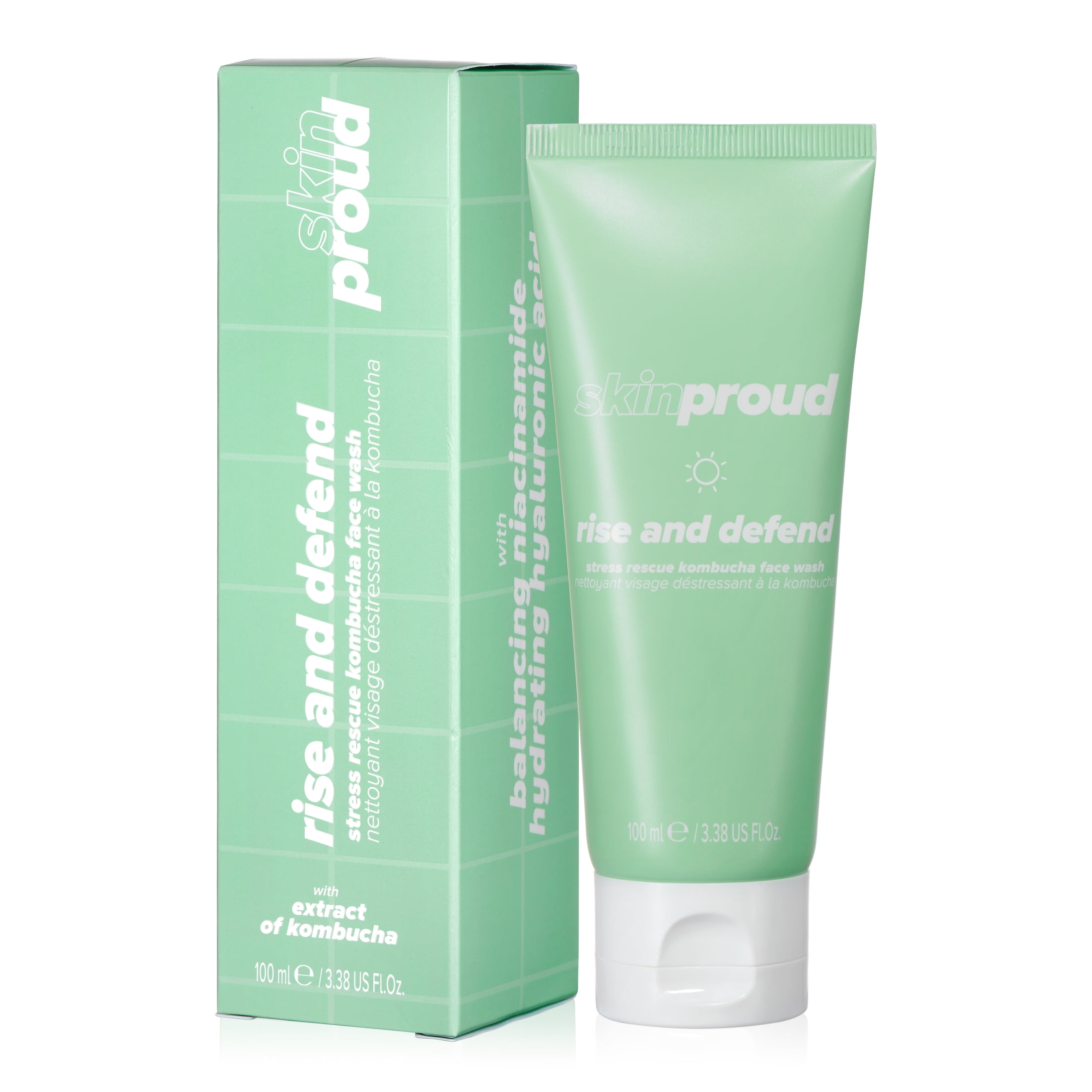 Skin Proud Rise & Defend, Stress Rescue Kombucha Face Cleanser with Niacinamide, 100% Vegan, 3.38 fl oz Ideal for morning or night, this gel- to-water face wash is powered by kombucha to remove impurities while helping to keep skin super soft and hydrated thanks to powerful niacinamide and sodium hyaluronate, for a refreshed and renewed glow. Formulated without sulphates. Suitable for all skin types, even sensitive skin.