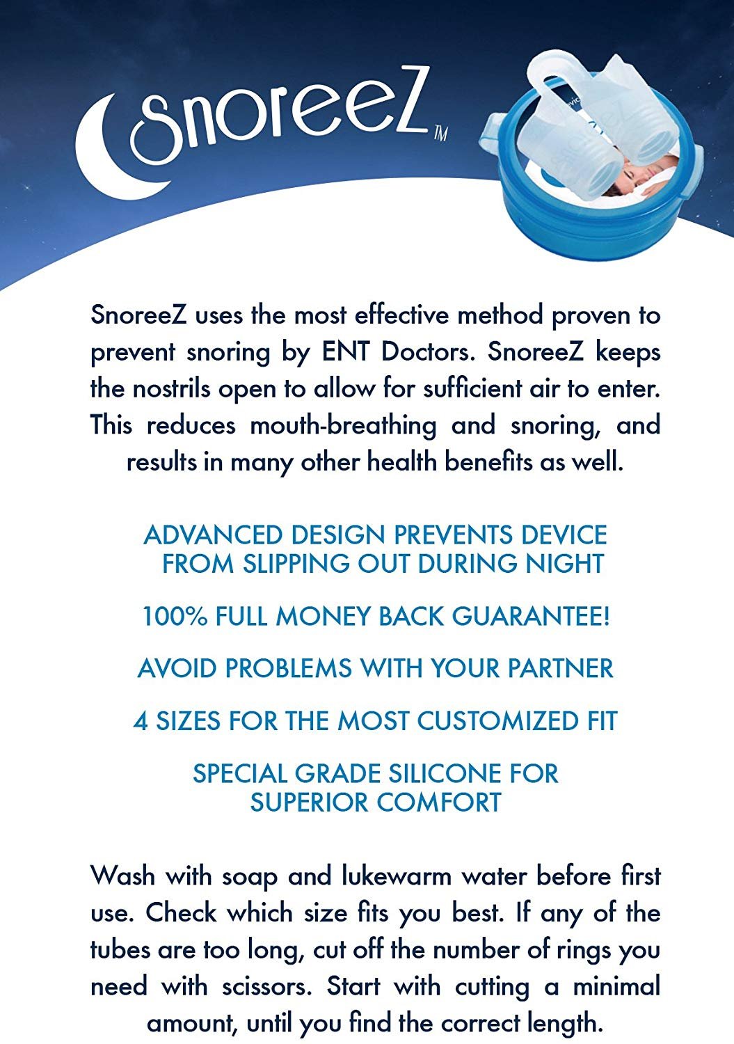 - INSTANT SNORE RELIEF – The SnoreeZ Anti-Snoring Nose Vents instantly stops snoring by maximizing the airflow in the nasal passageways. Pack includes a set of 4 pieces; use the nose vent that works best for you.