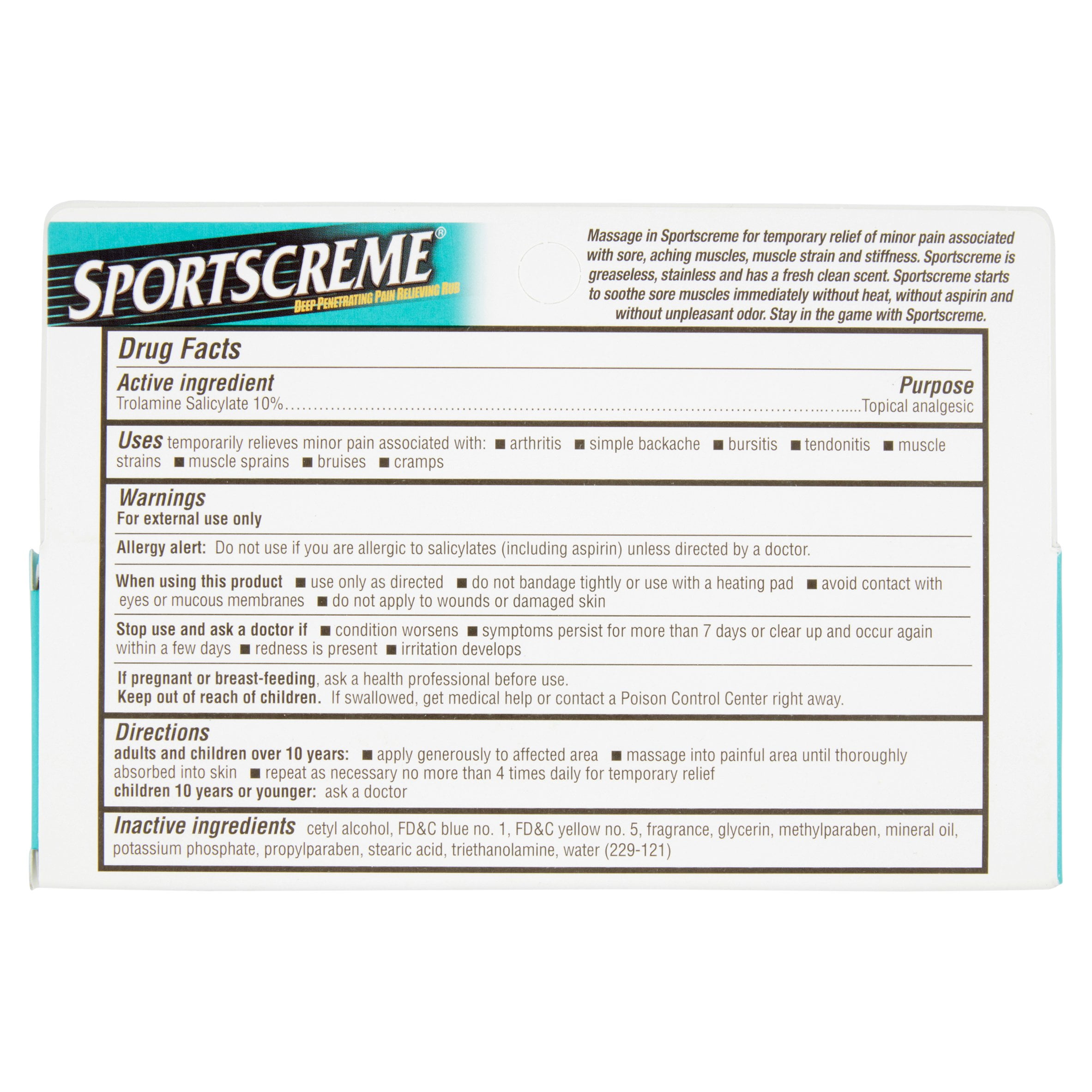 Stay in the game with the pain-relieving power of Sportscreme Topical Pain Relieving Rub. Formulated with trolamine salicylate 10%, this pain cream temporarily relieves minor pain associated with sore, aching muscles, and muscle strain. Experience soothing relief of painful muscles without heat. Best of all, Sportscreme starts working quickly, so you can stay in the game. Stock up on 3-ounce tubes of Sportscreme so you always have penetrating pain relief on hand. For adults and children over 10 years. DIRECTIONS: Apply generously to affected area; massage into painful area until thoroughly absorbed; repeat if necessary, but no more than 4 times daily for temporary relief.