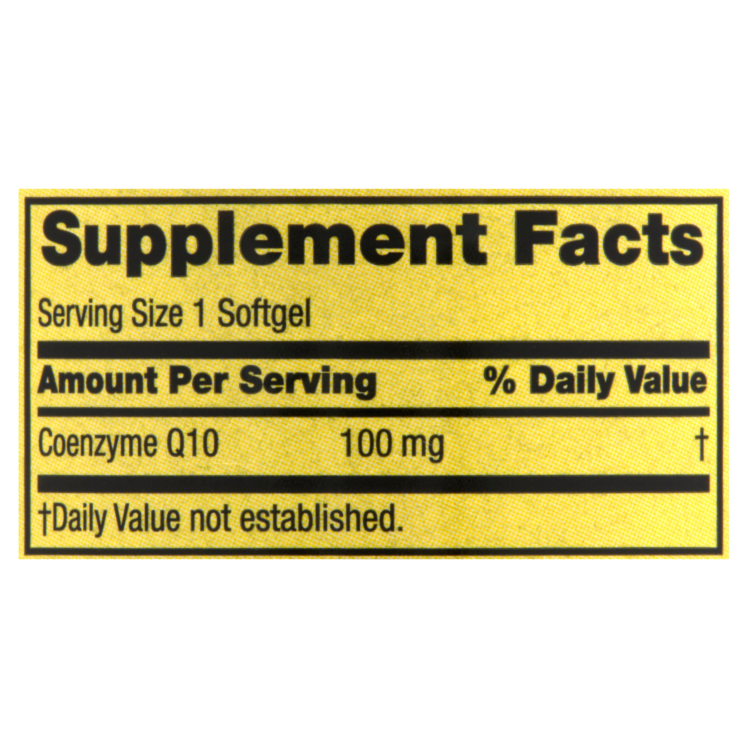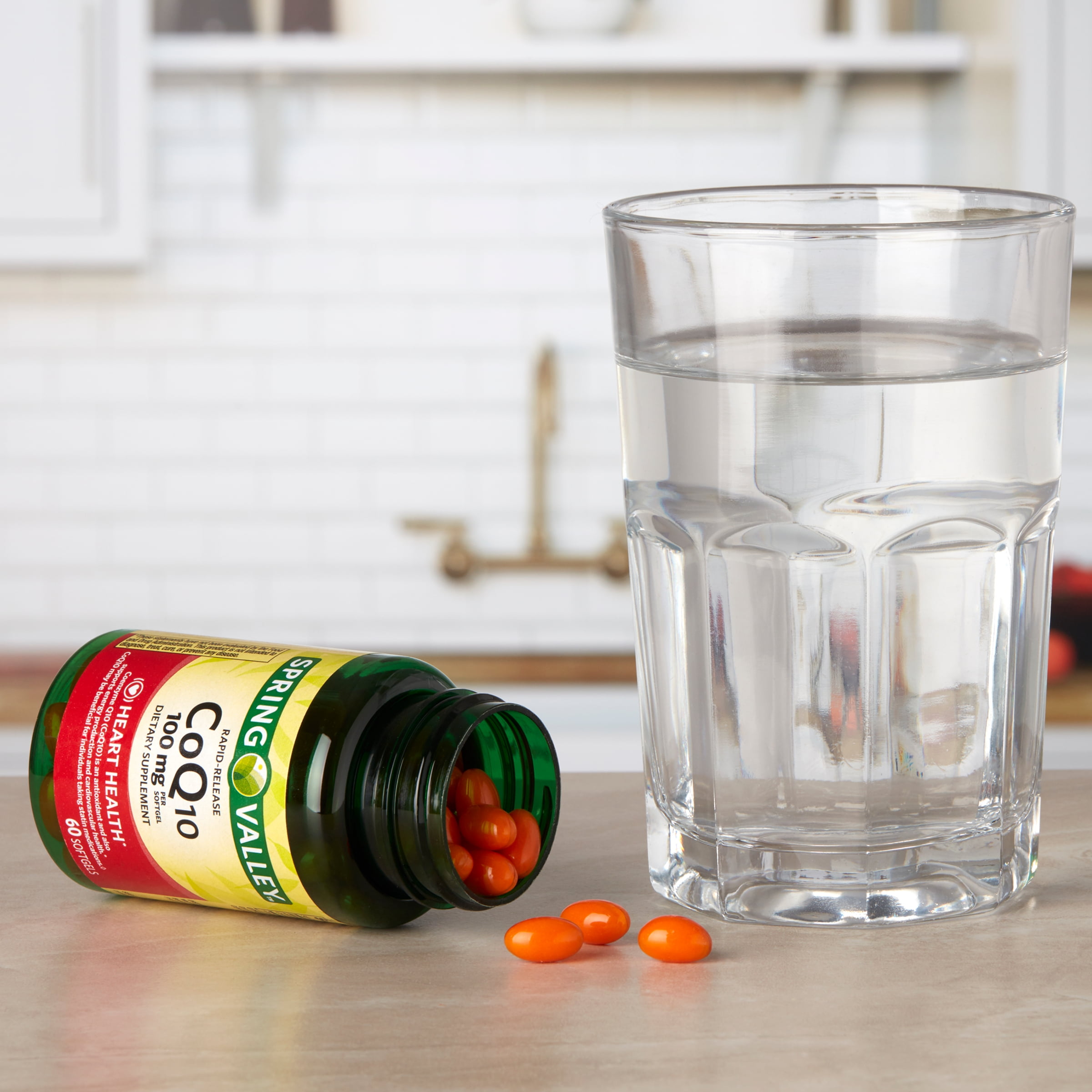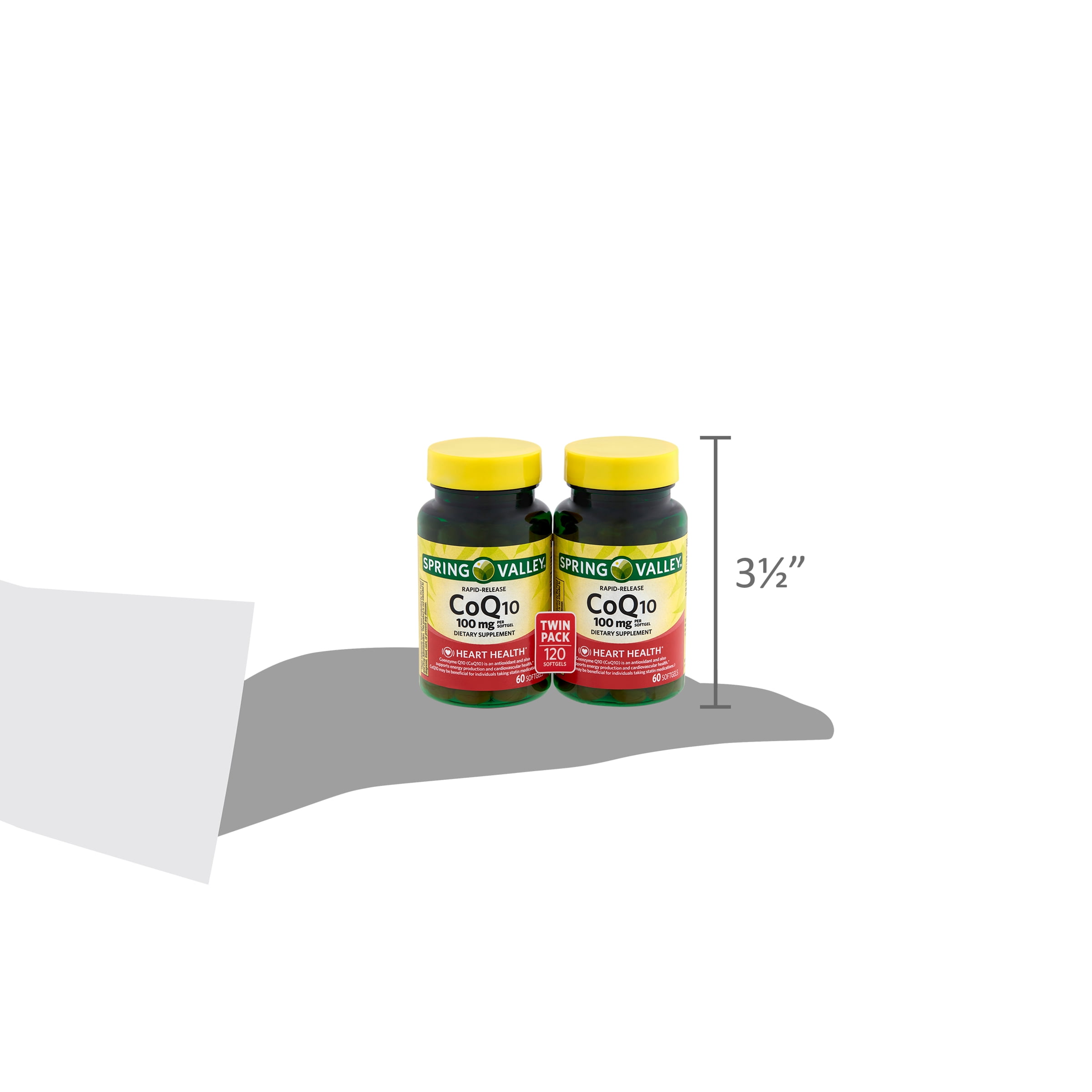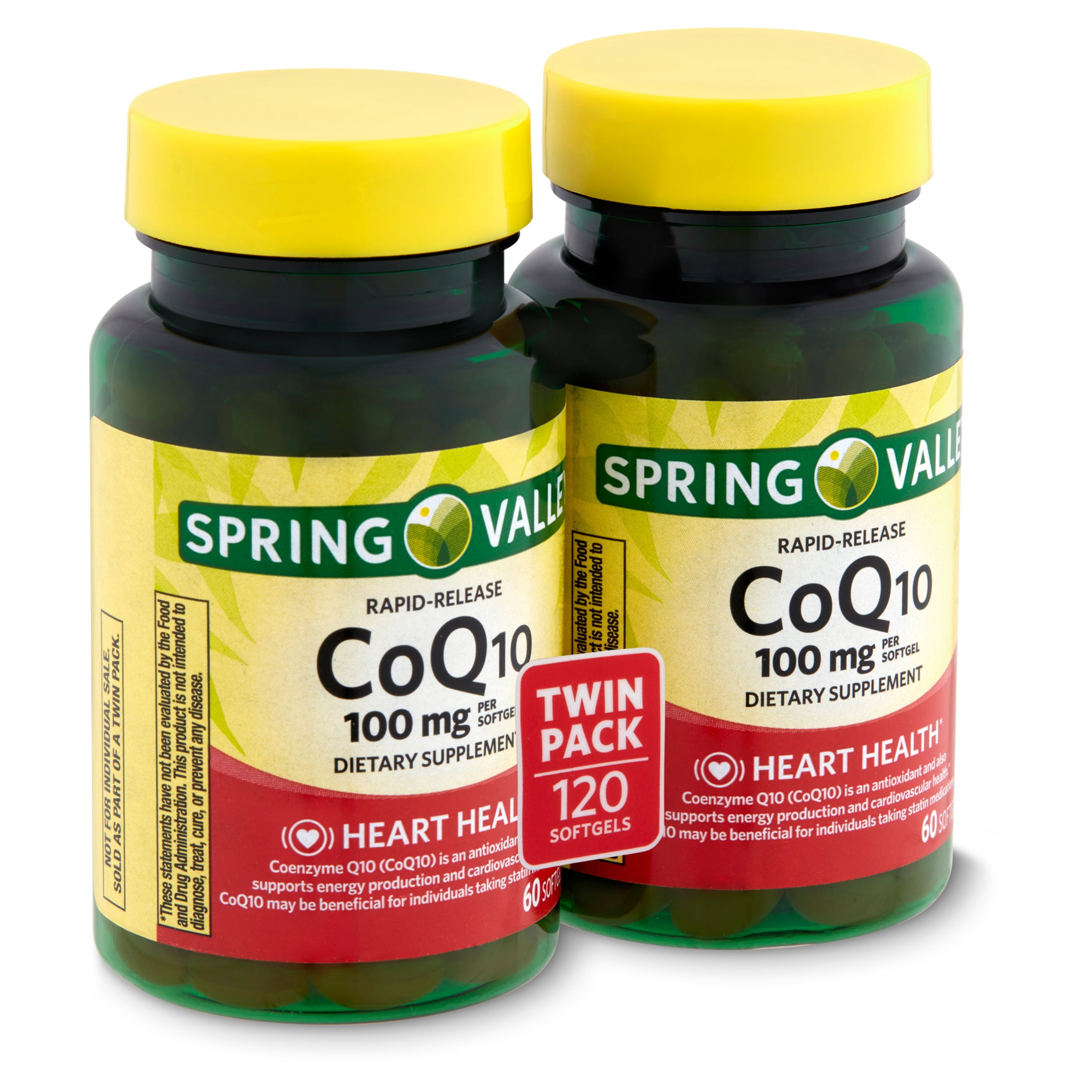 Support your heart health with our Spring Valley Rapid-Release CoQ10 Dietary Supplement Twin Pack, 100 mg. Coenzyme Q10 (CoQ10) is an antioxidant and also supports energy production and cardiovascular health. CoQ10 may also be beneficial for individuals taking statin medications. Our softgels contain no gluten, yeast, wheat, milk or milk derivatives, lactose, sugar, preservatives, artificial color, or artificial flavor, and contain less than 5 milligrams of sodium per serving. The suggested adult dosage is one softgel daily, preferably with a meal. You can rest assured that our Spring Valley Rapid-Release CoQ10 Dietary Supplement Twin Pack, 100 mg, is produced with strict quality guidelines and backed by our quality guarantee.
