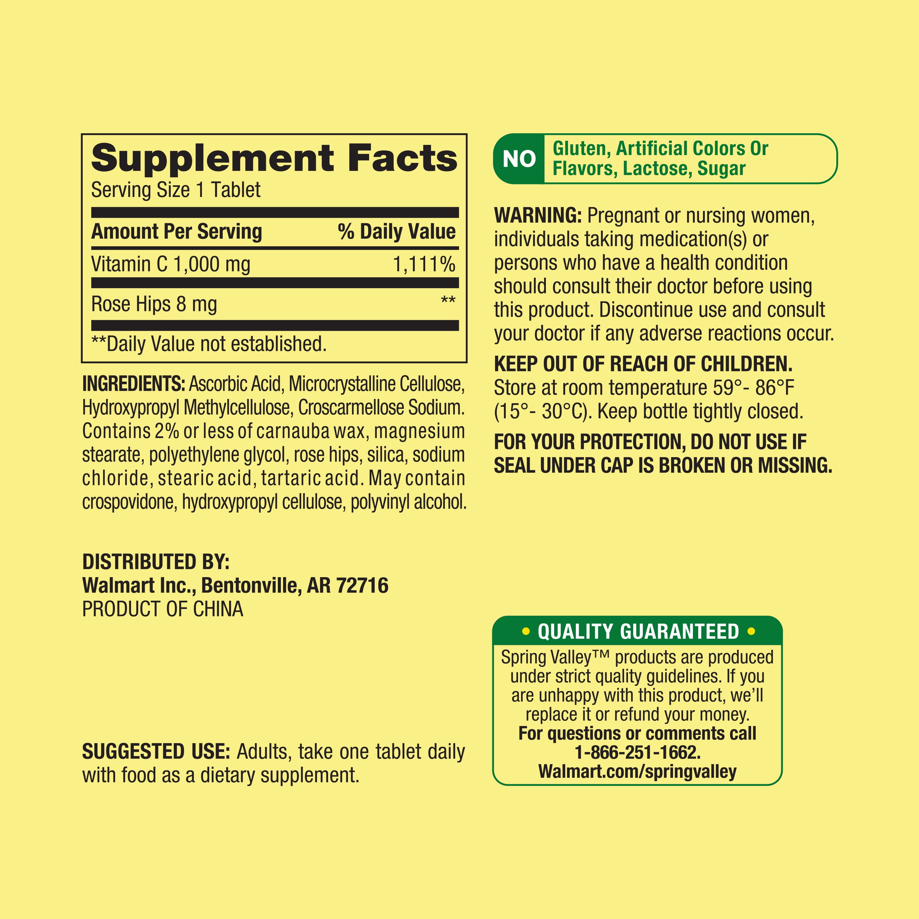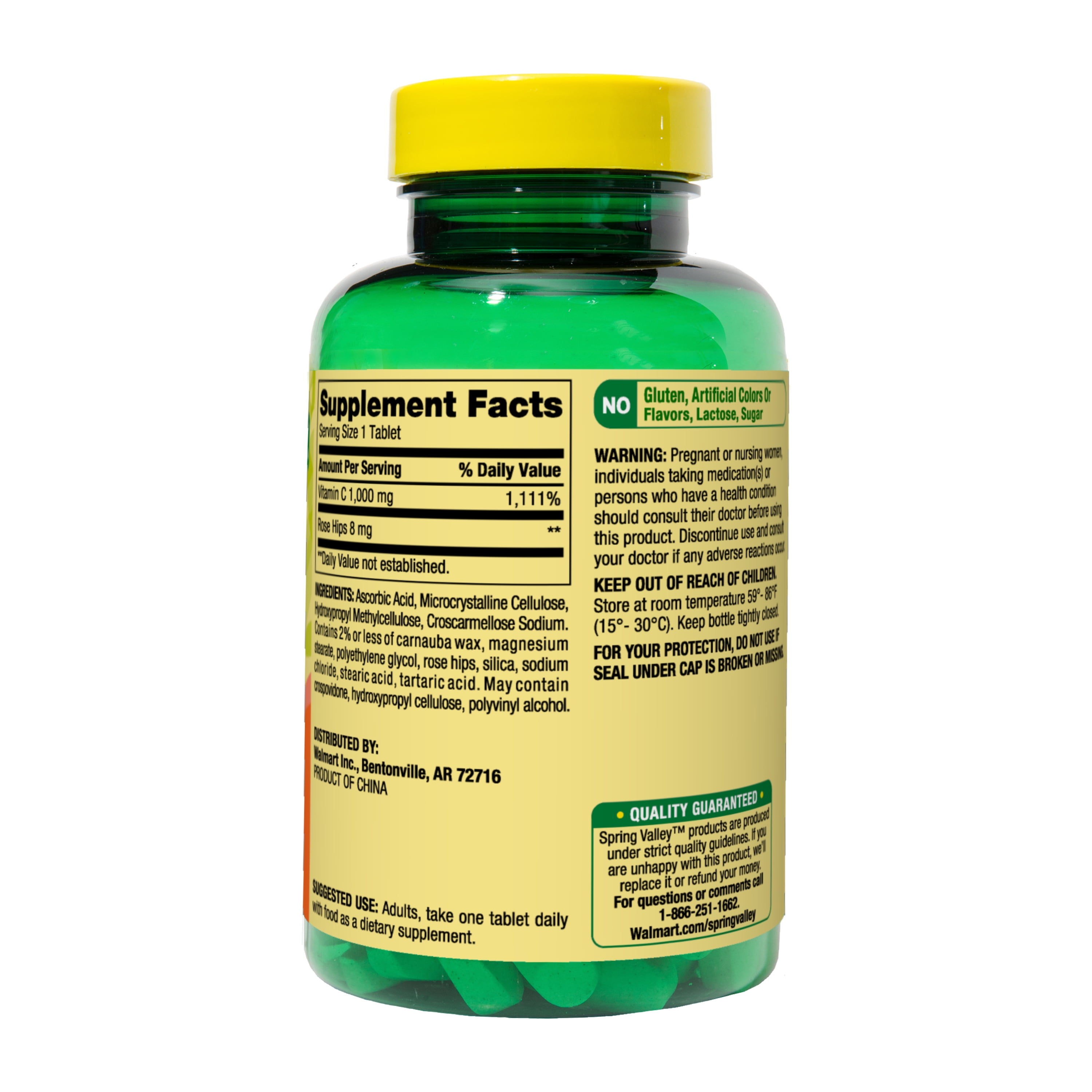 Our Spring Valley Vitamin C with Rose Hips Tablets Dietary Supplement, 1,000 mg is formulated to provide immune health support.* Each tablet delivers 1,000 mg of vitamin C and 8 mg of rose hips. Vitamin C is a potent antioxidant and an essential nutrient that may support immune, cardiovascular, and bone health.* These tablets contain no gluten, lactose, sugar, artificial colors or flavors. They are also suitable for a vegetarian diet. You can rest assured that Spring Valley Vitamin C with Rose Hips Tablets Dietary Supplement, 1,000 mg is produced with strict quality guidelines and is backed by our quality guarantee.